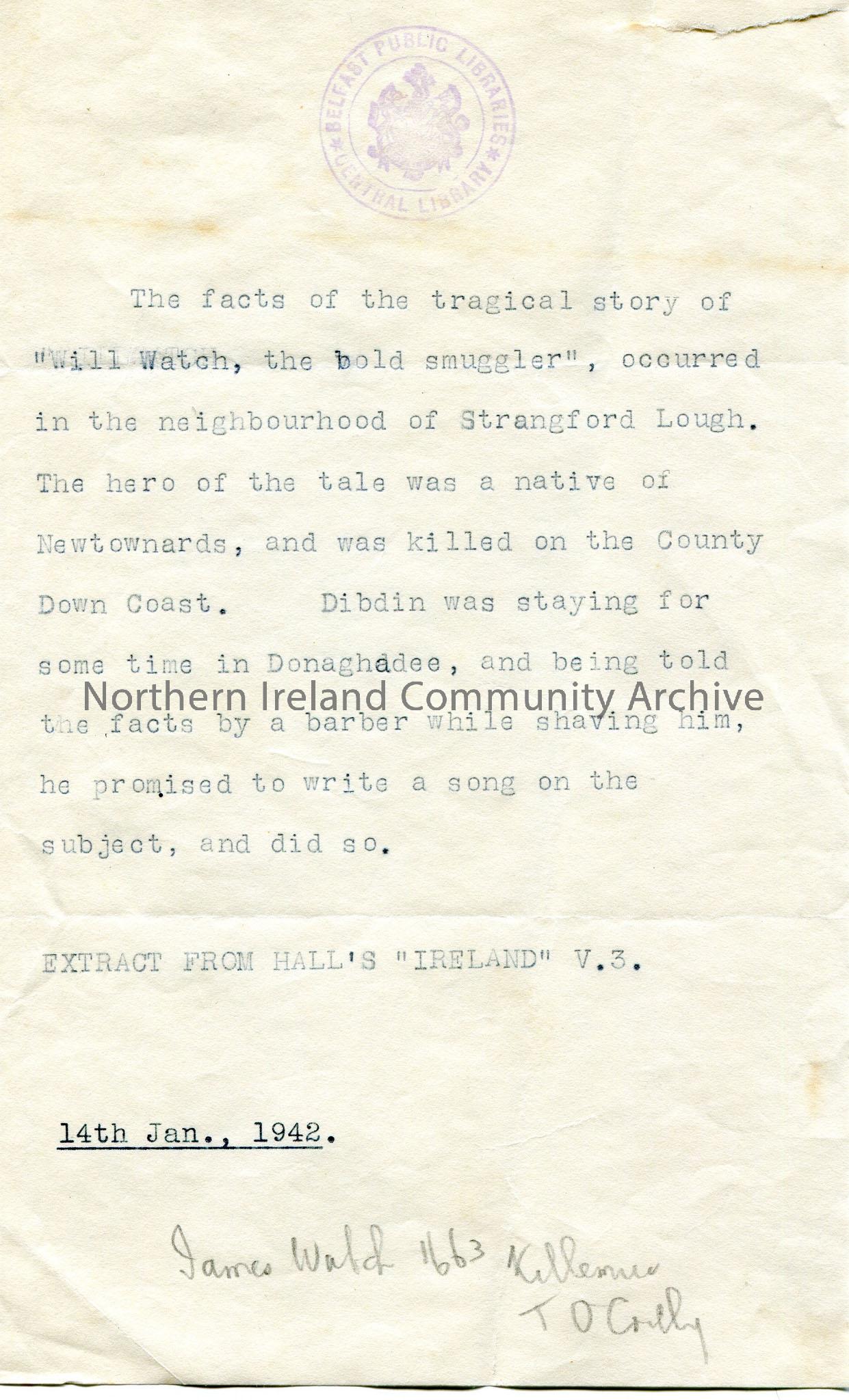 Typed document stamped with Belfast Public Libraries, Central Library crest. Extract from Hall's "Ireland" V.3. Refers to "Will Watch, the bold smuggler" and a song having been written about the subject by Dibdin. 'James Watch 1663 Kill...? T O Crilly' handwritten in pencil at bottom of page.