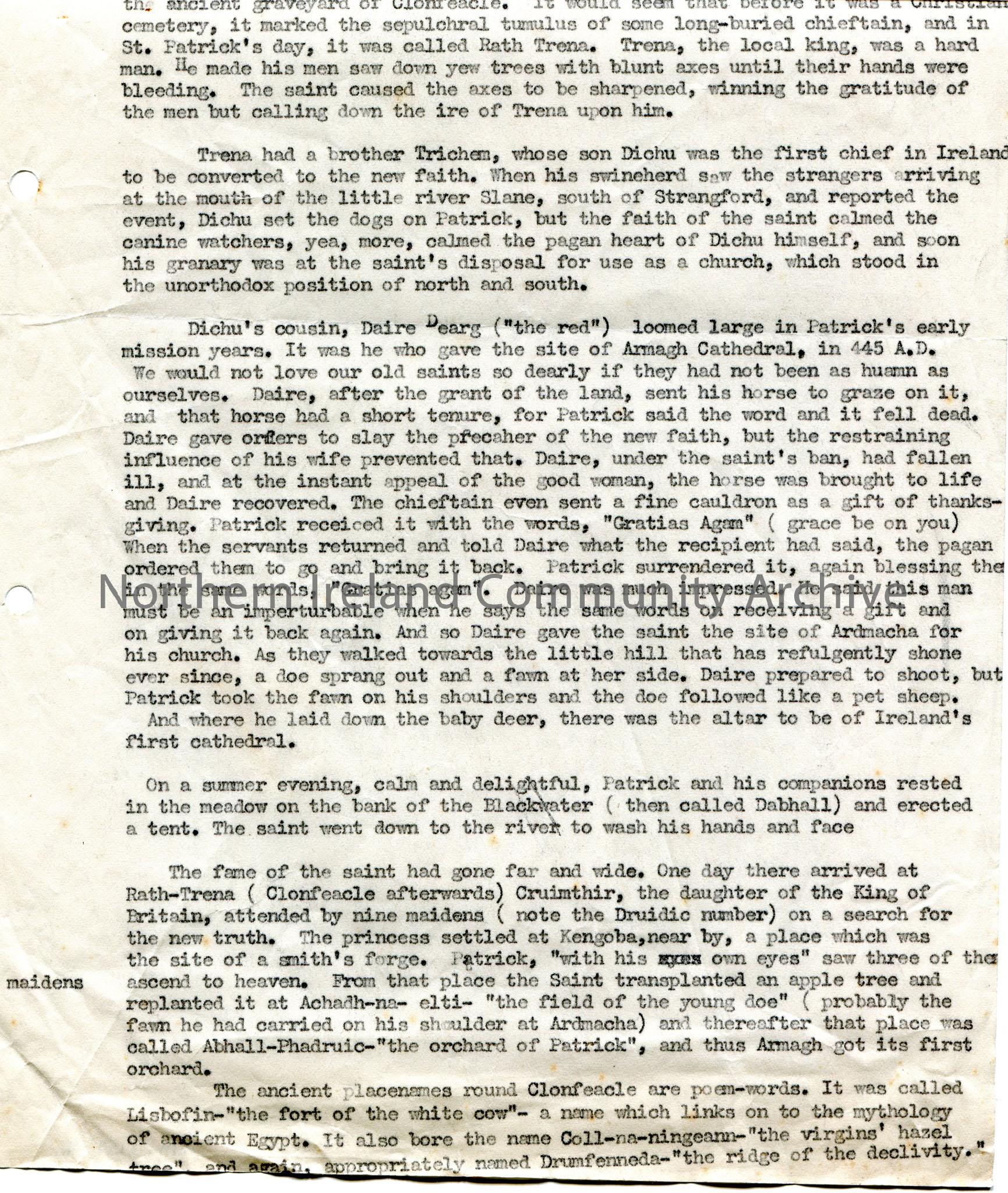 Typed document titled, 'A Ramble Round Benburb. Armagh's First Apple Orchard. Saint Patrick's Lost Tooth'. Re graveyard at Clonfeacle. Refers to the local King Trena and his nephew Dichu, the first chief in Ireland to be converted to Christianity, Dichu's cousin Daire Dearg. Refers to placenames around Clonfeacle.