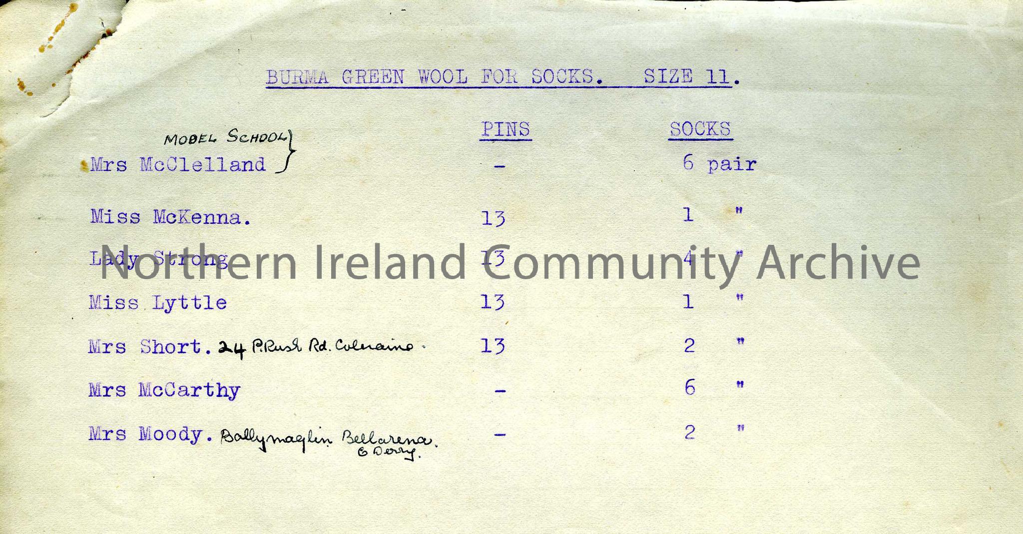 Typed document titled, ‘Burma Green Wool for Socks. Size 11.’