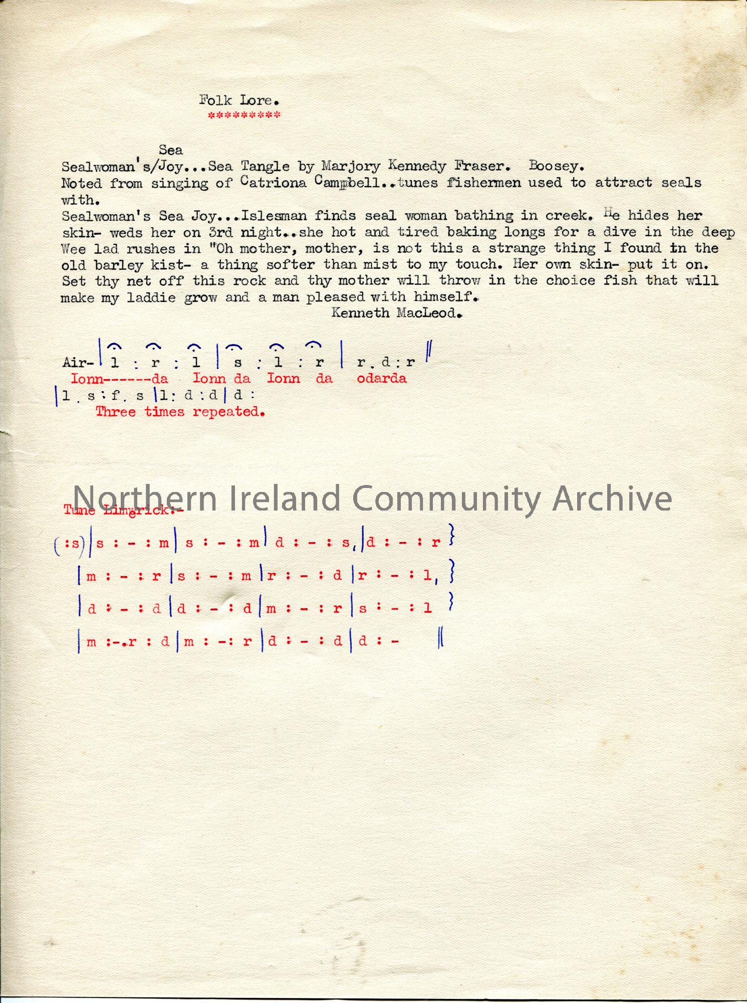 Typed document titled 'Folk Lore'. Re Sealwoman's Seal Joy...Sea Tangle by Marjorie Kennedy Fraser. Story of a seal woman - Kenneth MacLeod. Typed tonic sol-fa notation of tune 'Limerick'.