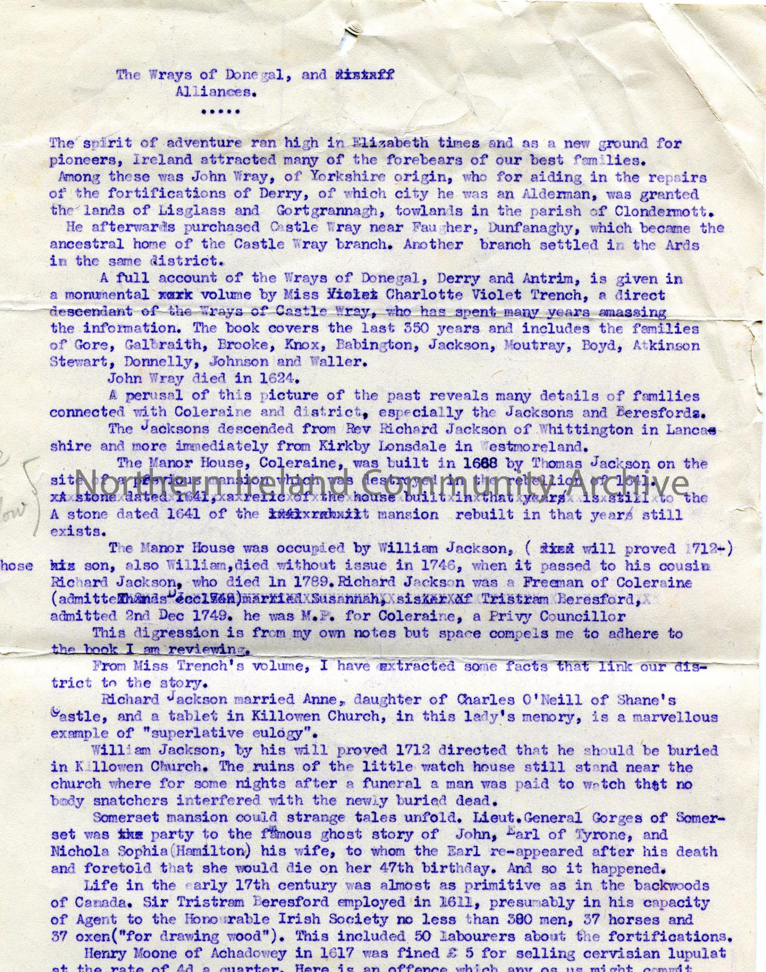 Typed document titled, 'The Wrays of Donegal, and Alliances'. Review of a book by Miss Charlotte Violet Trench, a direct descendant of the Wrays of Castle Wray. Refers to Jackson and Beresford families of Coleraine. Details re the Manor House, Coleraine. Refers to Killowen, Sir Tristram Beresford, Agent to the Hon Irish Society, Henry Moone of Achadowey, Boyd property at Ballycastle. 'See A below' written in pencil to left of notes.