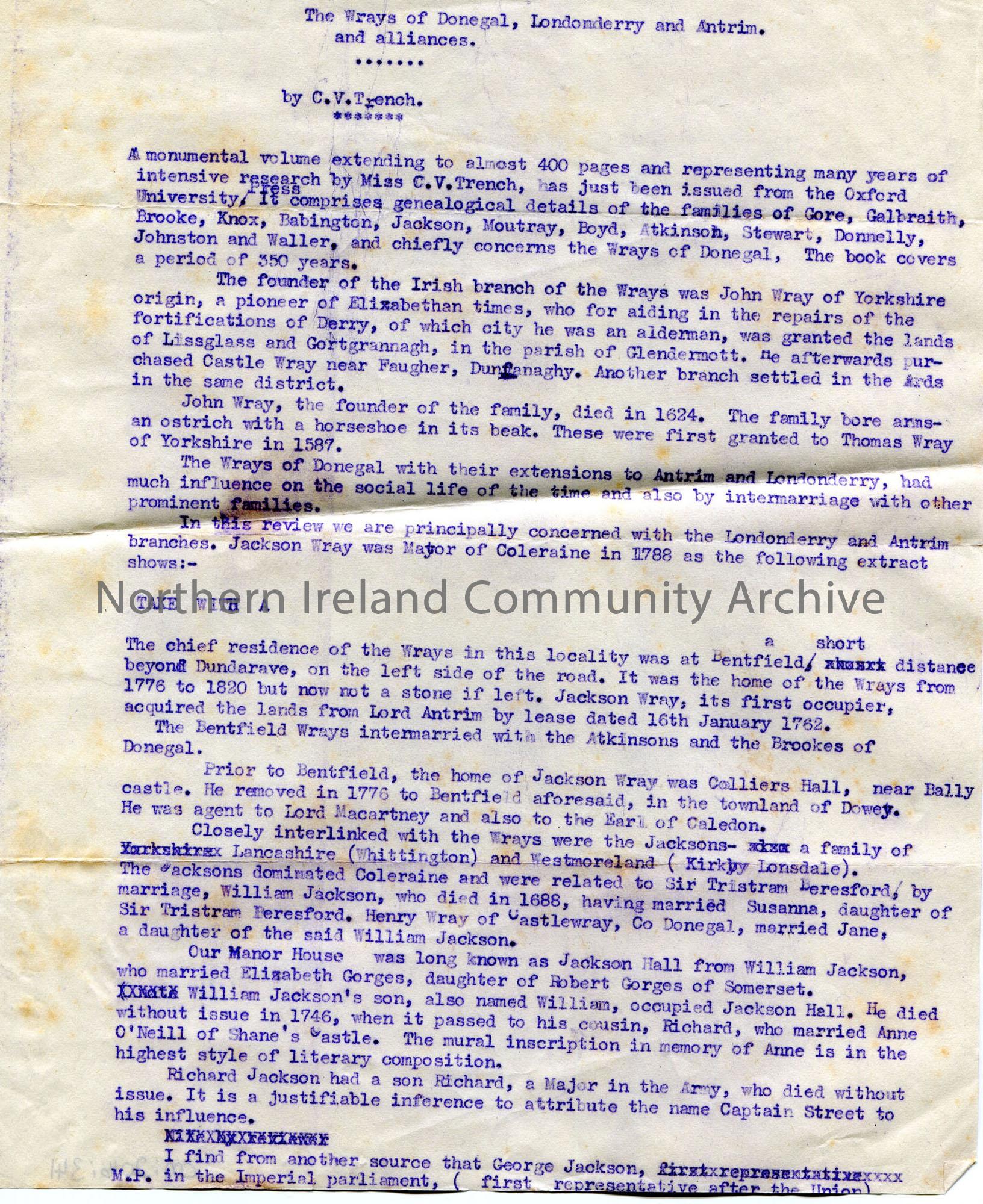 Typed document titled, 'The Wrays of Donegal, Londonderry and Antrim. and alliances. by C.V.Trench'. Review of book of genealogical details compiled by Miss C.V.Trench, of various families. Refers to history of the Wray family and Jacksons in Coleraine.