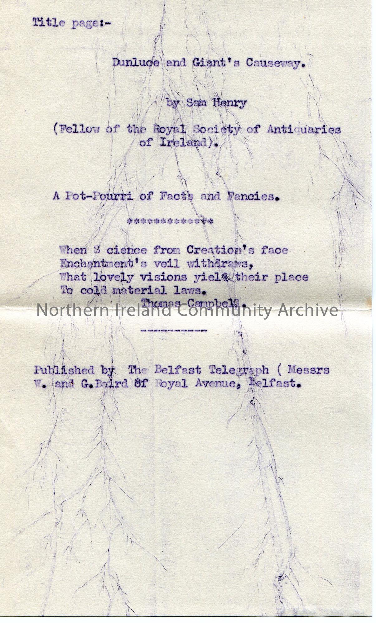 Typed draft title page of Sam Henry’s book ‘Dunluce and Giant’s Causeway’.