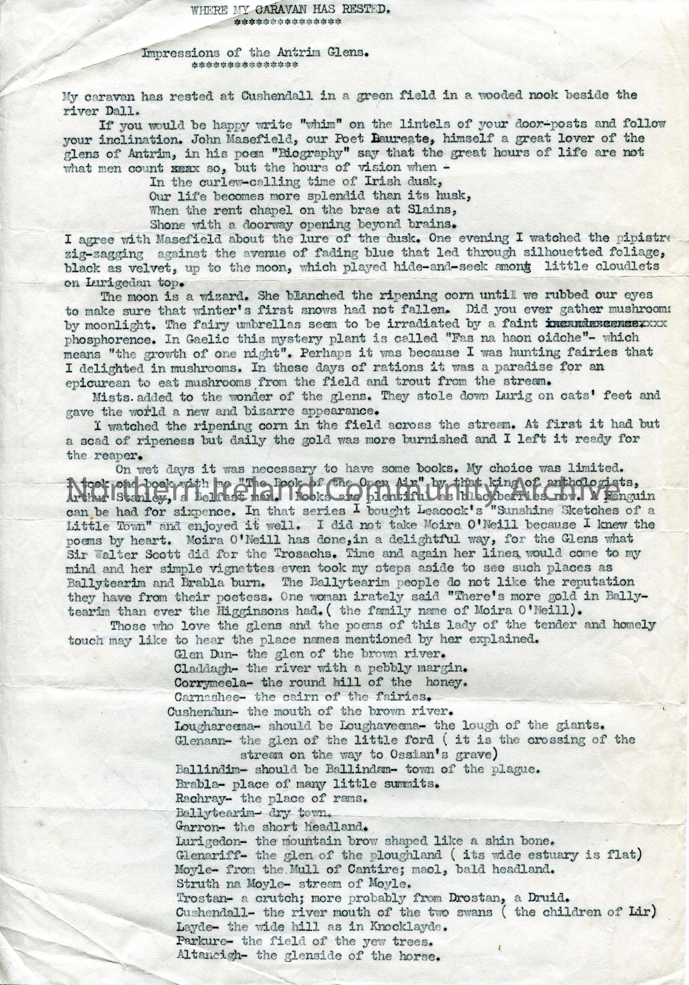 Typed draft version (one page, other pages missing) of an article which appeared in a newspaper - see below. Titled 'Where My Caravan Has Rested. Impressions of the Antrim Glens'.