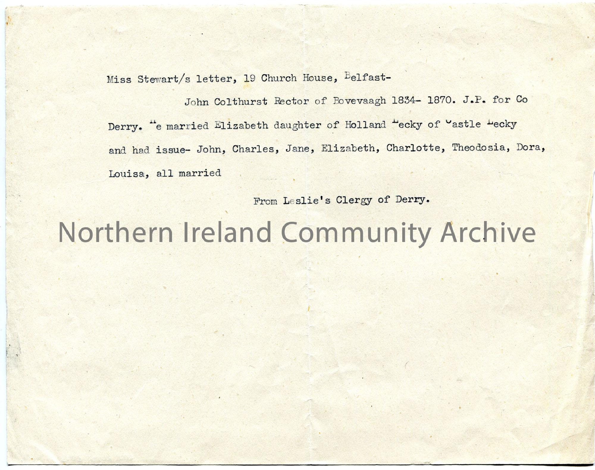 Typed extract from a letter. Mentions John Colhurst, Rector of Bovevaagh 1834-1970, J. P. for County Derry and his marriage to Elizabeth Lecky.
