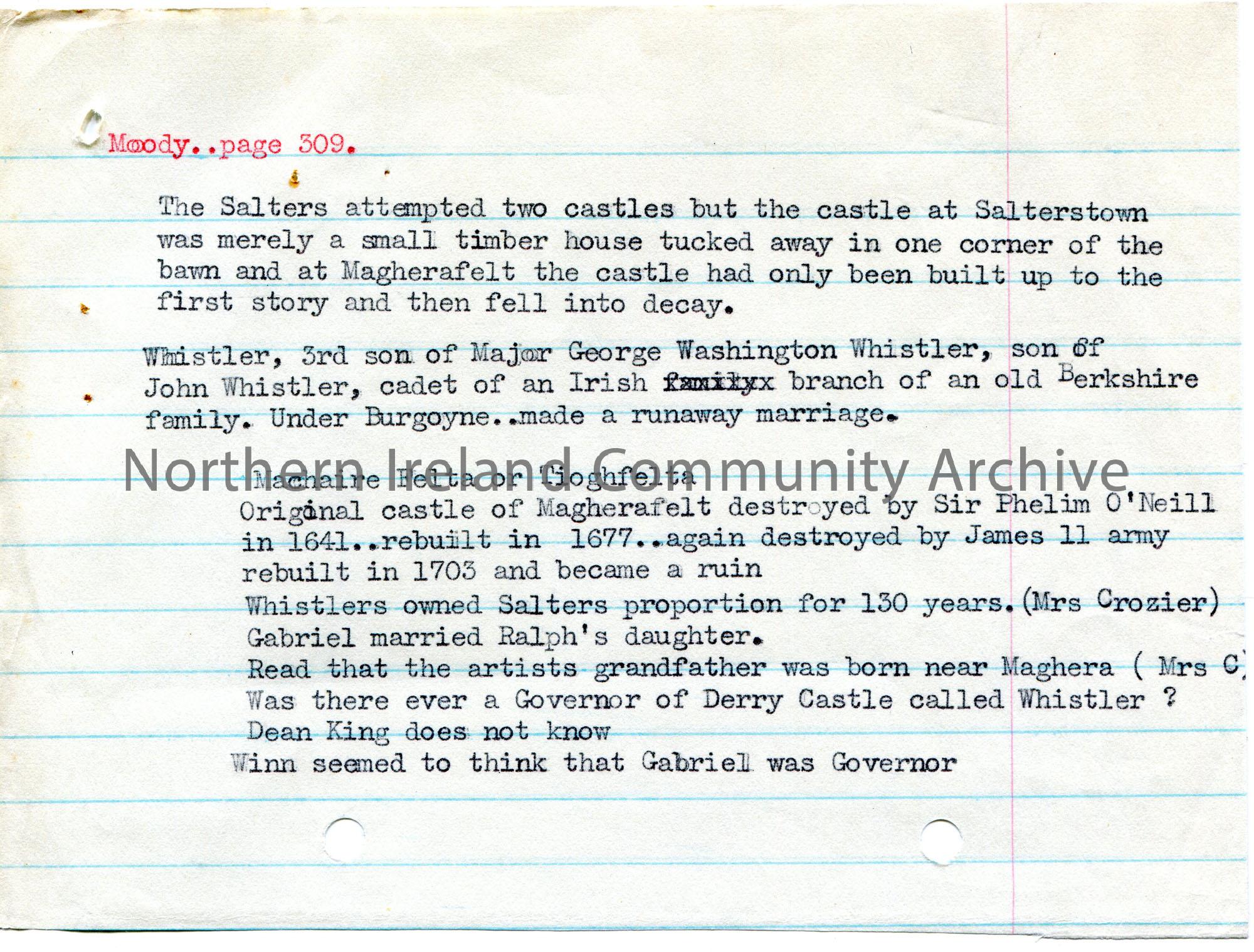 Typed extract on lined paper from Moody…page 309. Re the Salters of Salterstown and family name Whistler.