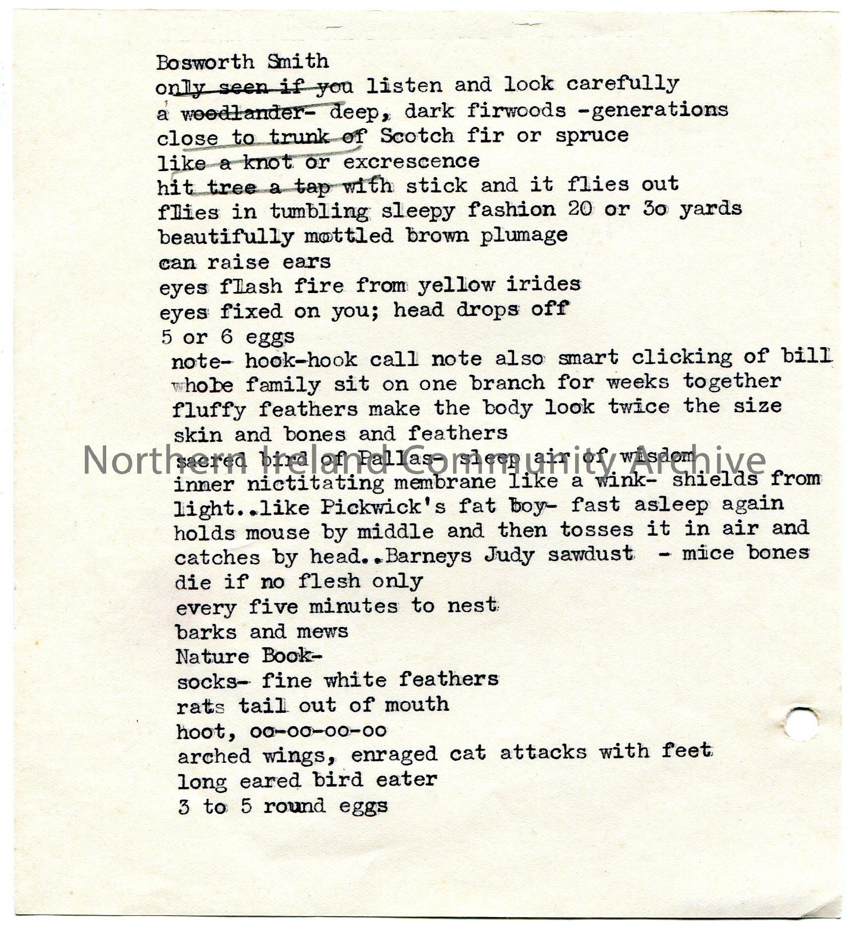 Typed extracts from books re bird(s). Does not state which bird(s). Lists their features, eating habits, etc. 5 lines are marked in pencil.