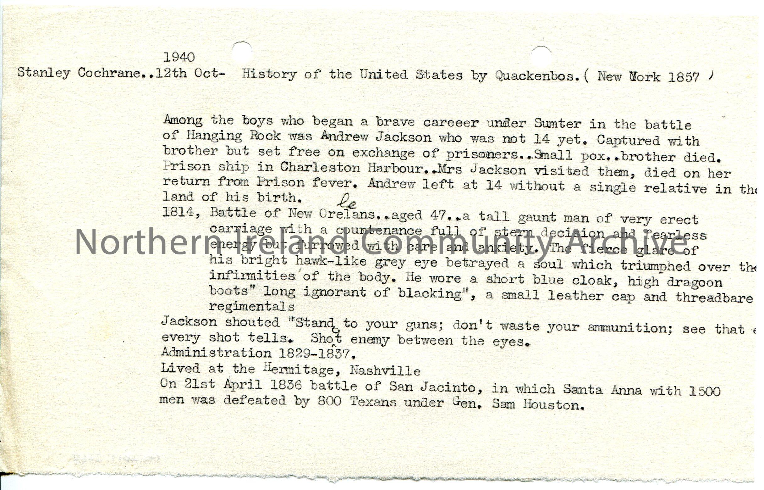 Typed extracts from Stanley Cochrane, 12th October 1940, ‘History of the United States’ by Quackenbos (New York 1857). Mentions Andrew Jackson and Sam…