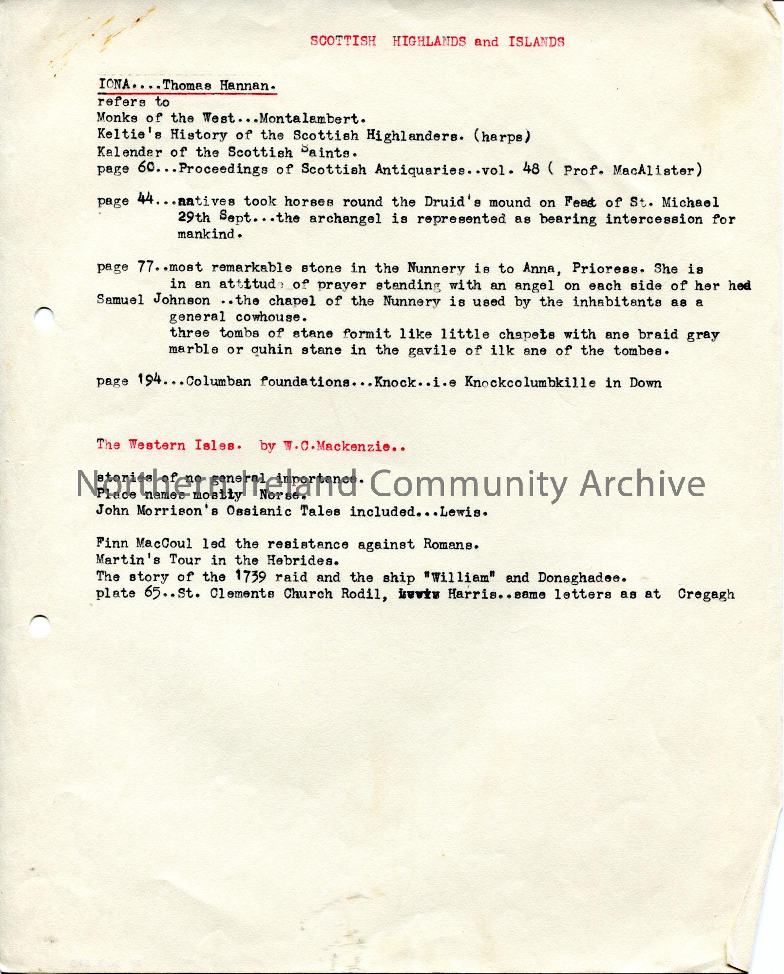 Typed extracts titled ‘Scottish Highlands and Islands’. Taken from two books – ‘Iona’ by Thomas Hannan [1928] and ‘The Western Isles’ by W. C. Mackenz…