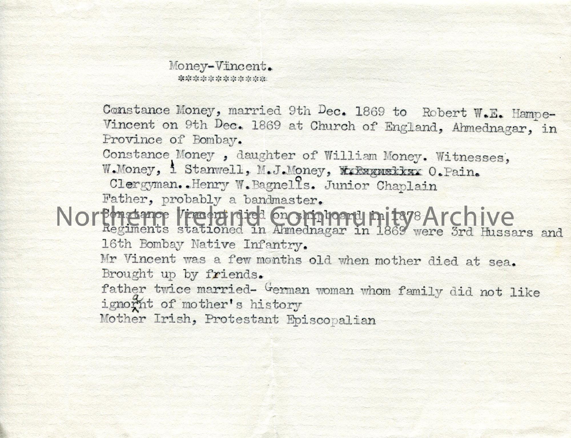 Typed family history notes of Mr F. A. M. Vincent. Titled, 'Money-Vincent'. Money was his mother's maiden name and Sam has been asked to trace his mother's side of the family. She was originally from Ireland but lived in India.