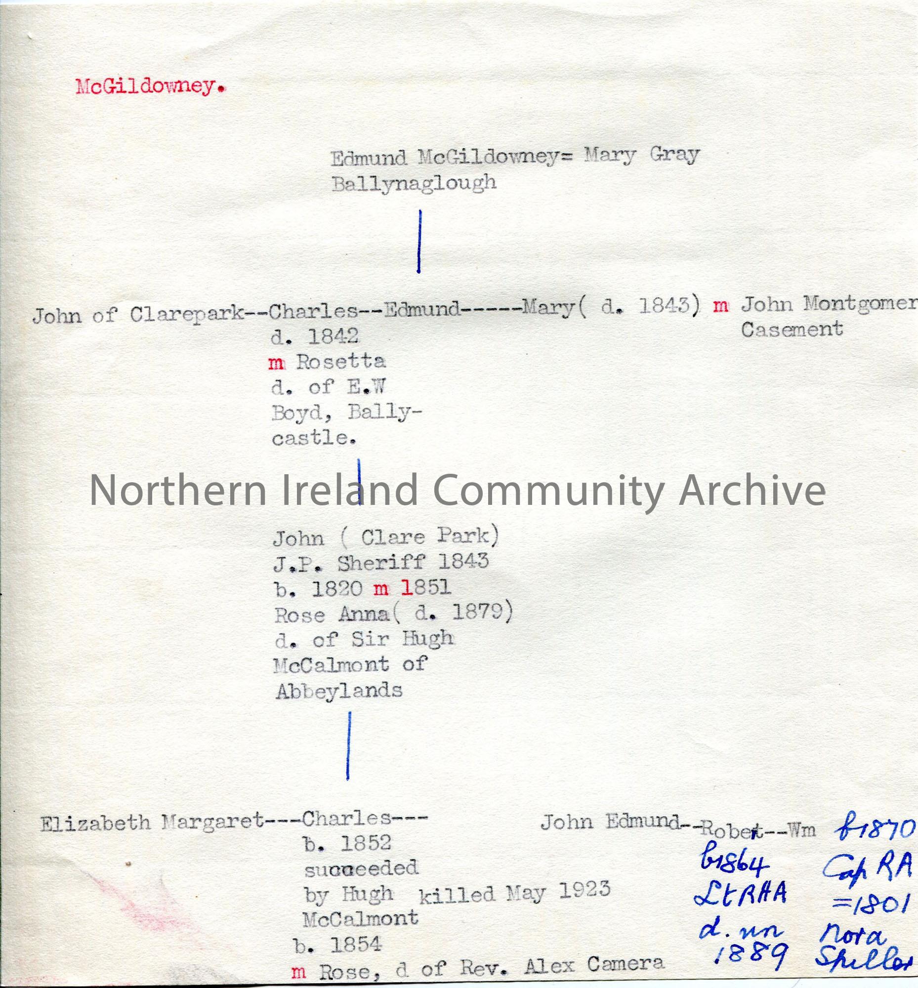 Typed family line of McGildowney family in 19th century – mentions McCalmont, Casement and Boyd of Ballycastle