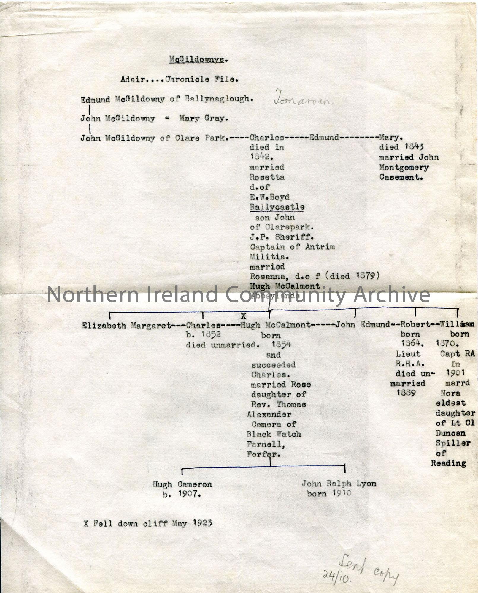 Typed family lineage of McGildowney family 19th century. Mentions McCalmont, Casement and Boyd of Ballycastle
