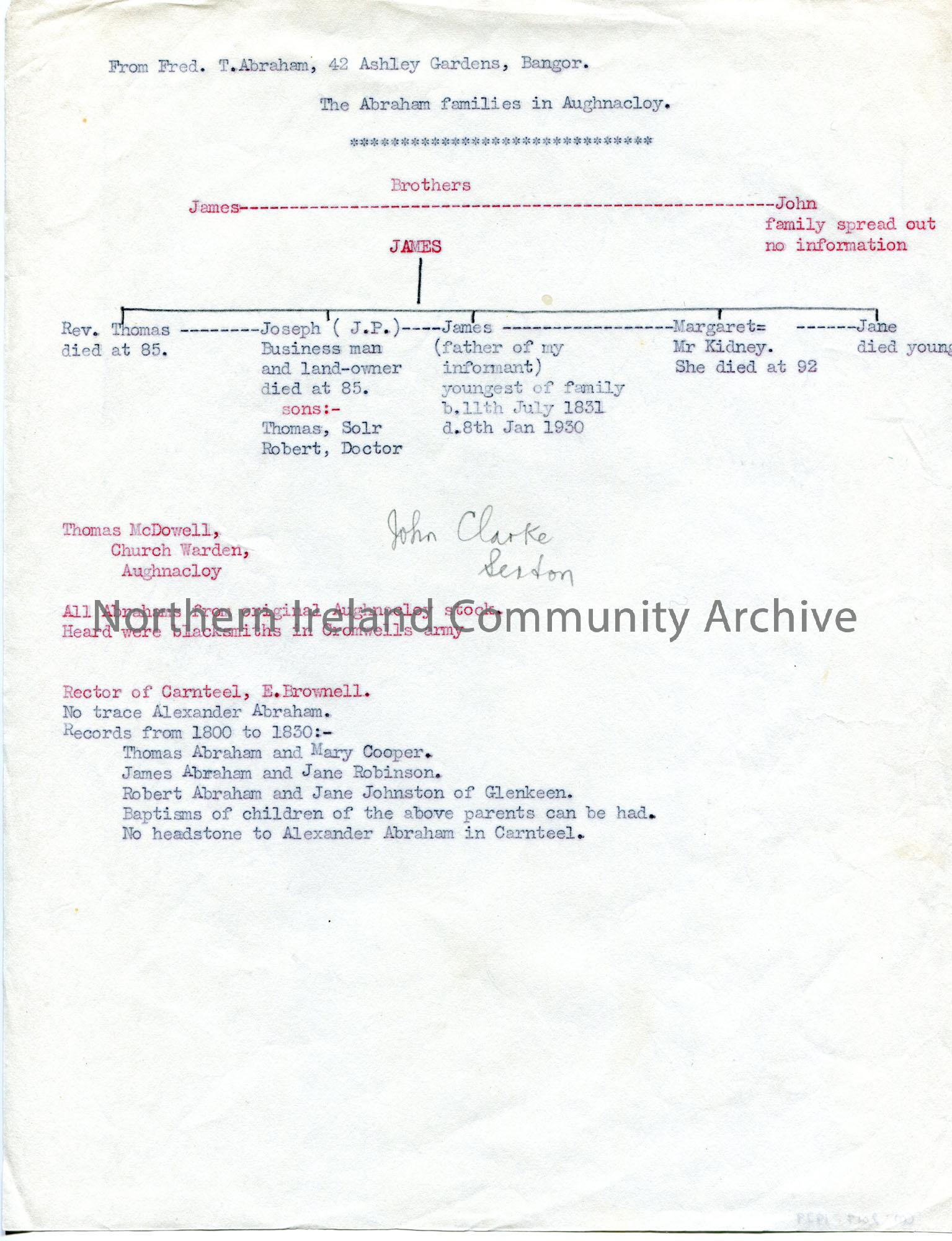 Typed family tree and additional notes re Abraham family genealogy. From Fred T Abraham, 42 Ashley Gardens, Bangor. Titled 'The Abraham families in Aughnacloy'.