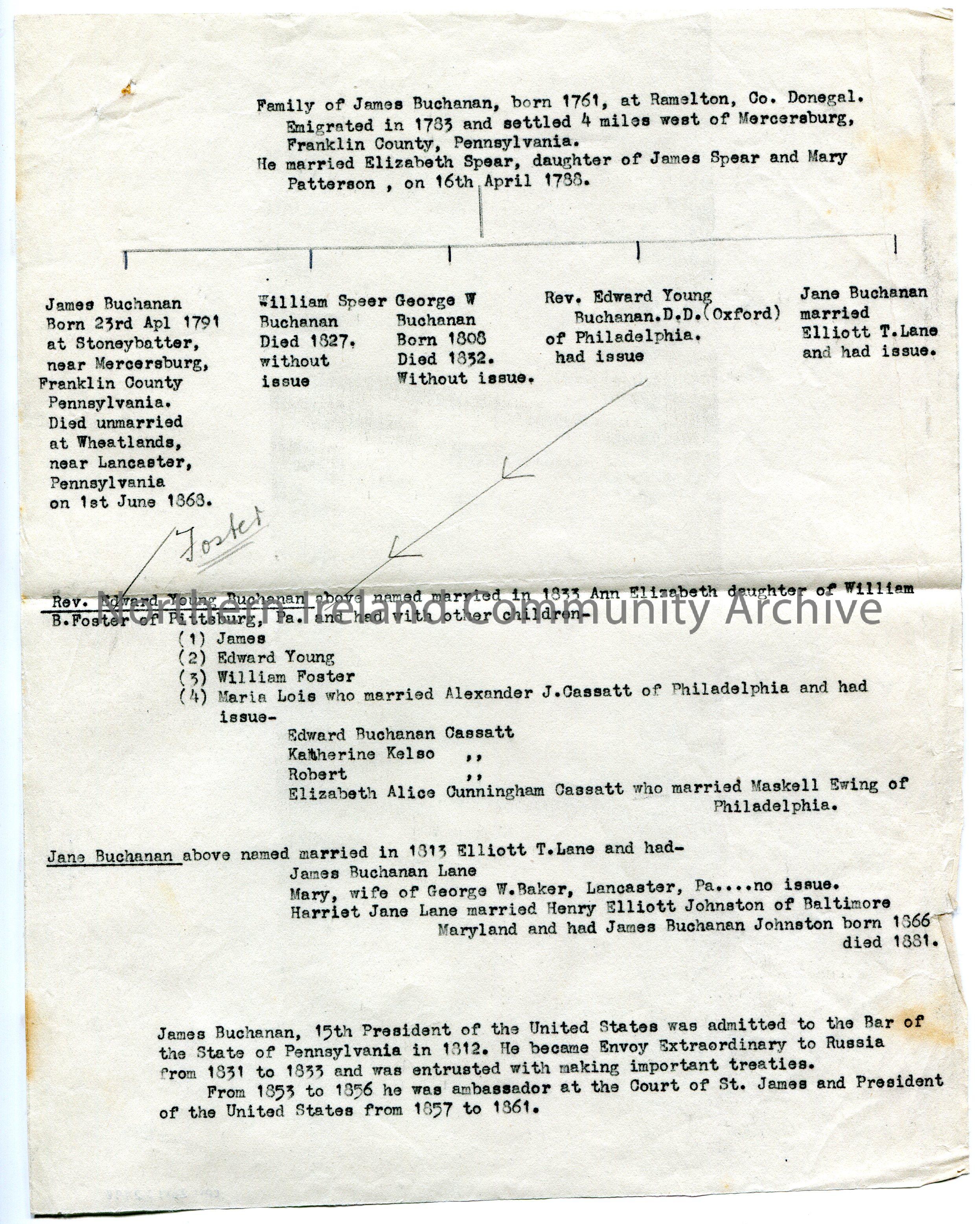 Typed family tree and genealogical notes re surname Buchanan. Begins with James Buchanan, born 1761, of Ramelton, Co. Donegal. An arrow drawn in pencil and the surname 'Foster' handwritten in pencil at the name of William B Foster of Pittsburg.