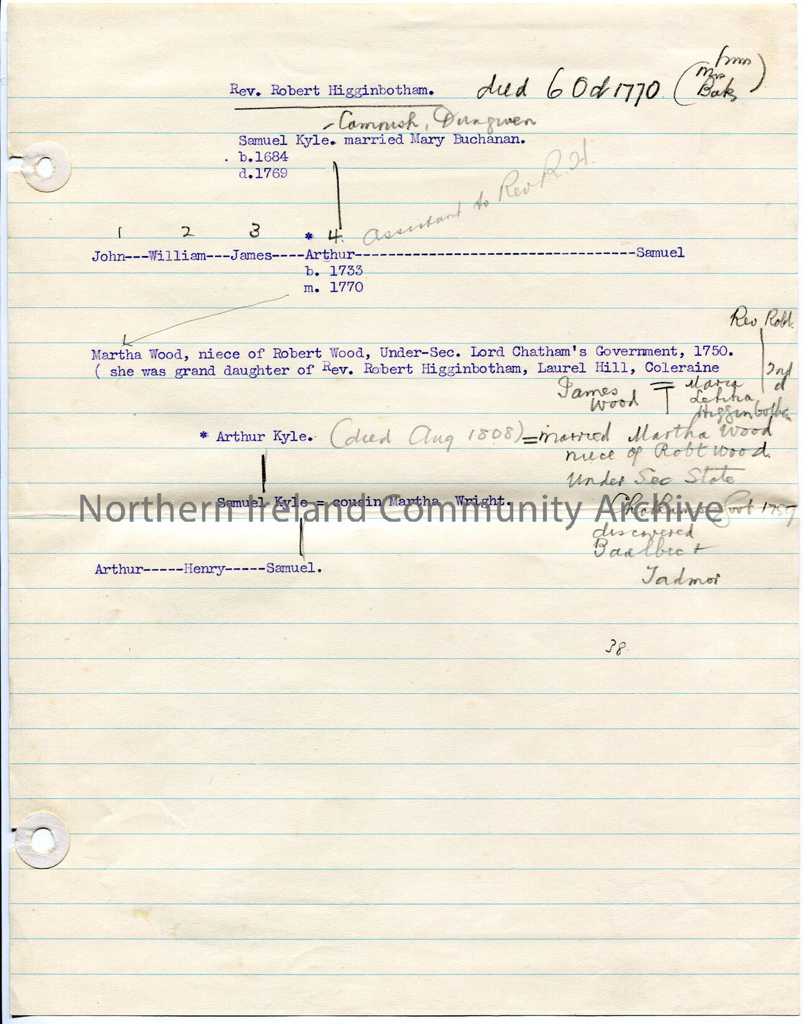 Typed family tree, annotated in pencil, of Rev Robert Higginbotham. Mentions Laurel Hill, Coleraine.