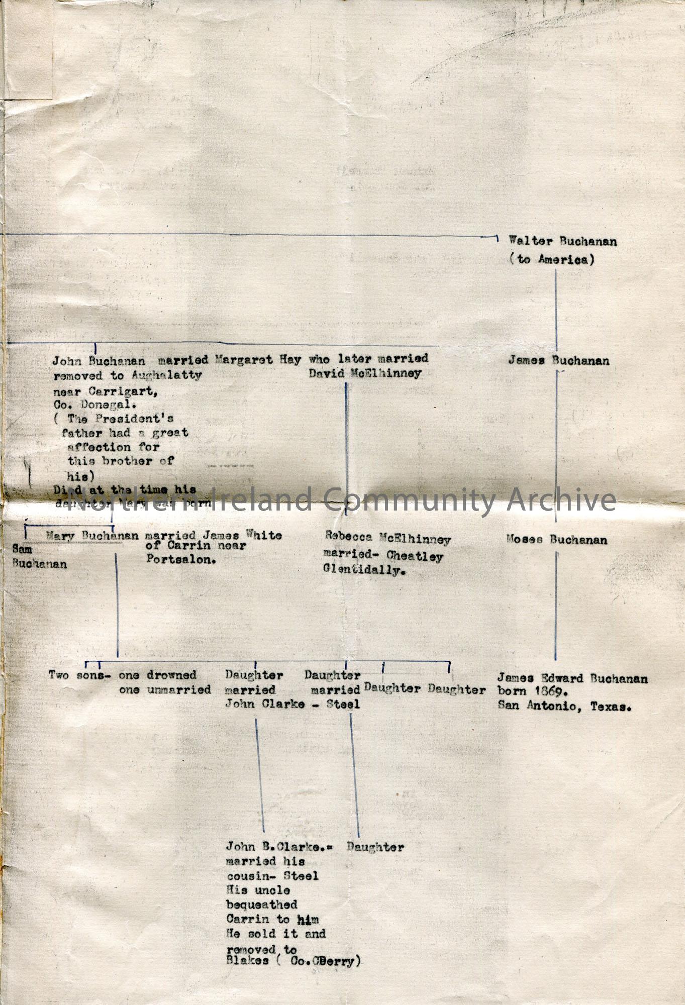 Typed family tree of Buchanan family of Donegal. Titled, 'Buchanan Genealogy'.