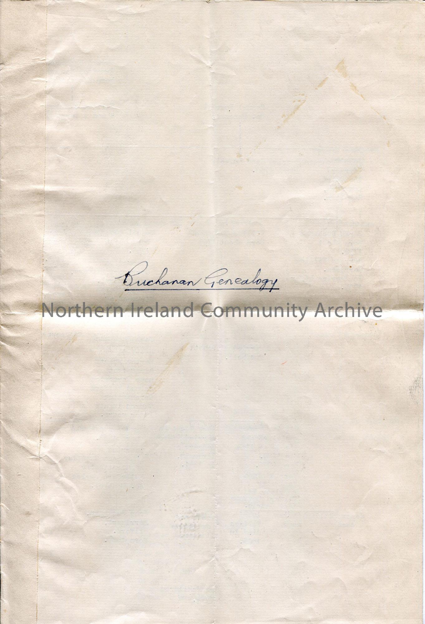 Typed family tree of Buchanan family of Donegal. Titled, ‘Buchanan Genealogy’.