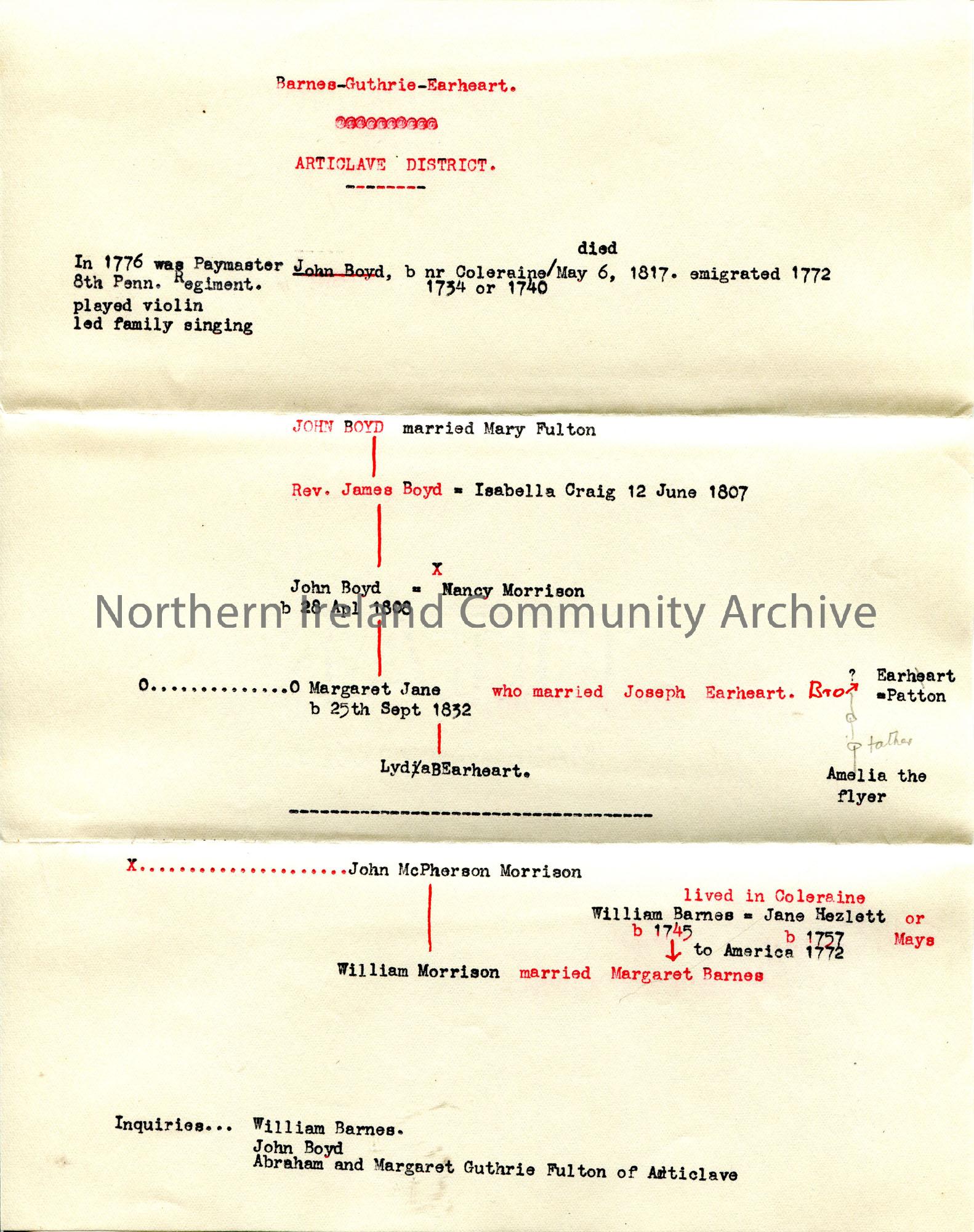 Typed family tree of John Boyd from Coleraine who emigrated to America 1772. The notes are headed, 'Barnes-Guthrie-Earhart. ARTICLAVE DISTRICT'. This was genealogy research carried out for Miss Lida B Earhart, Washington.