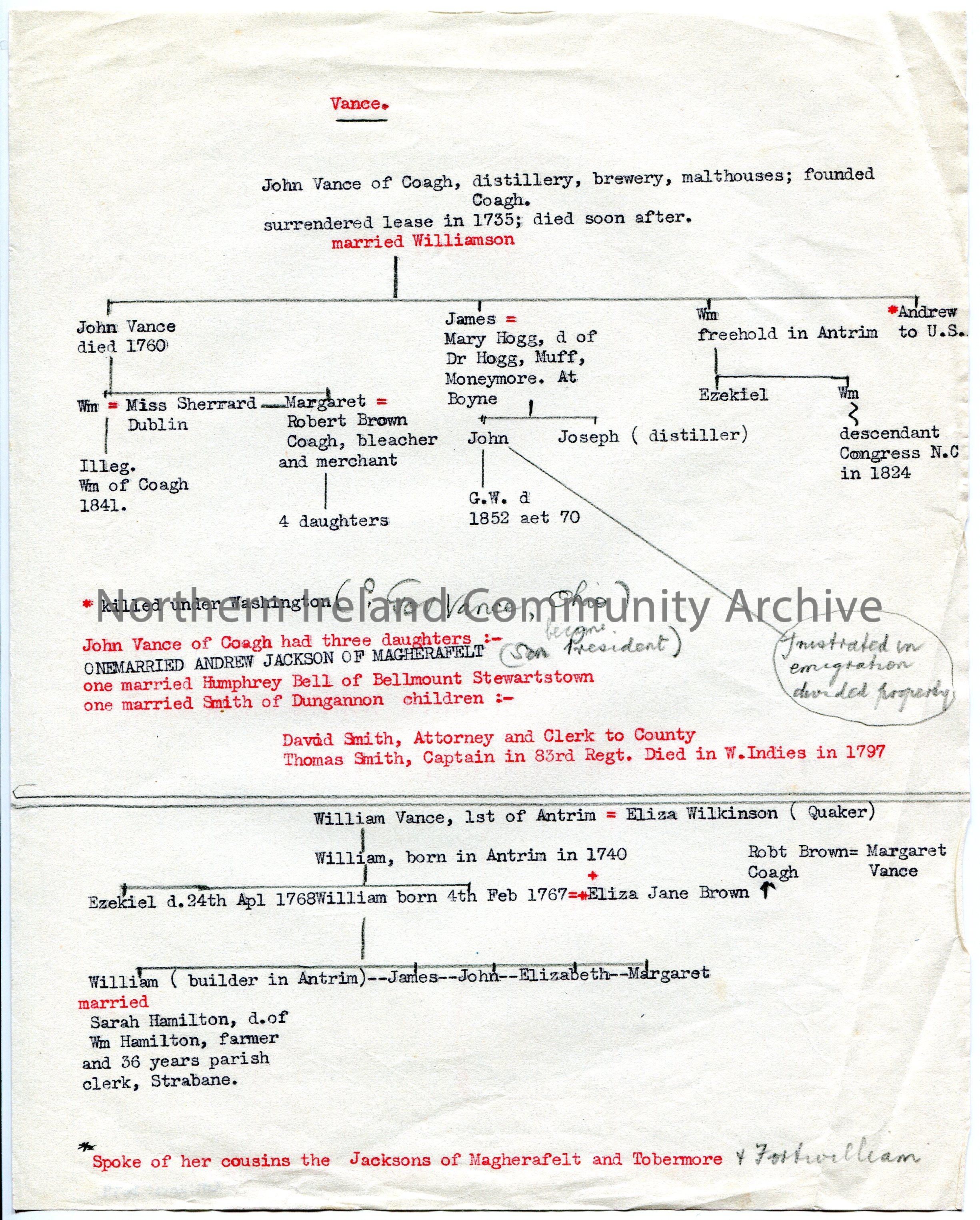 Typed family tree of surname Vance. John Vance of Coagh at start of tree. Annotated in pencil. Dated 18th and 19th century.