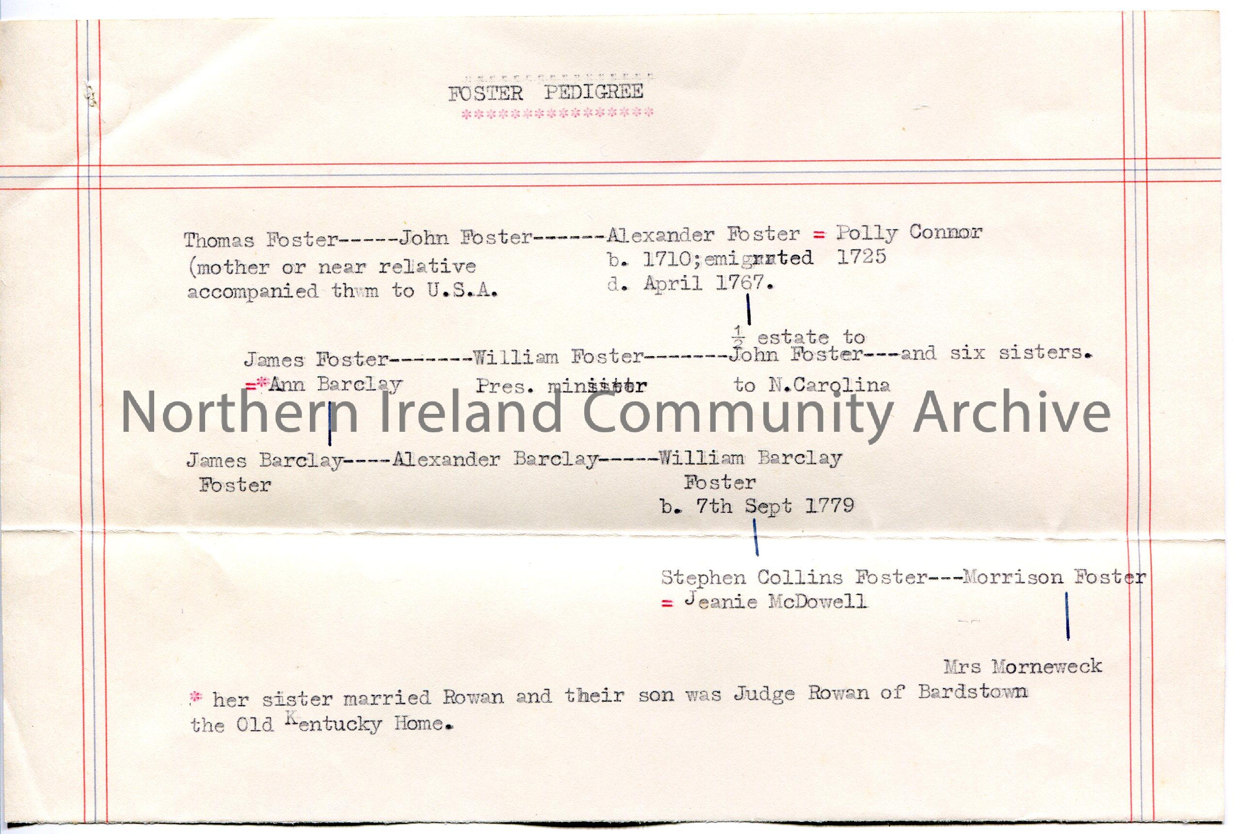 Typed family tree on blank paper with red and blue lined border titled, ‘Foster Pedigree’.