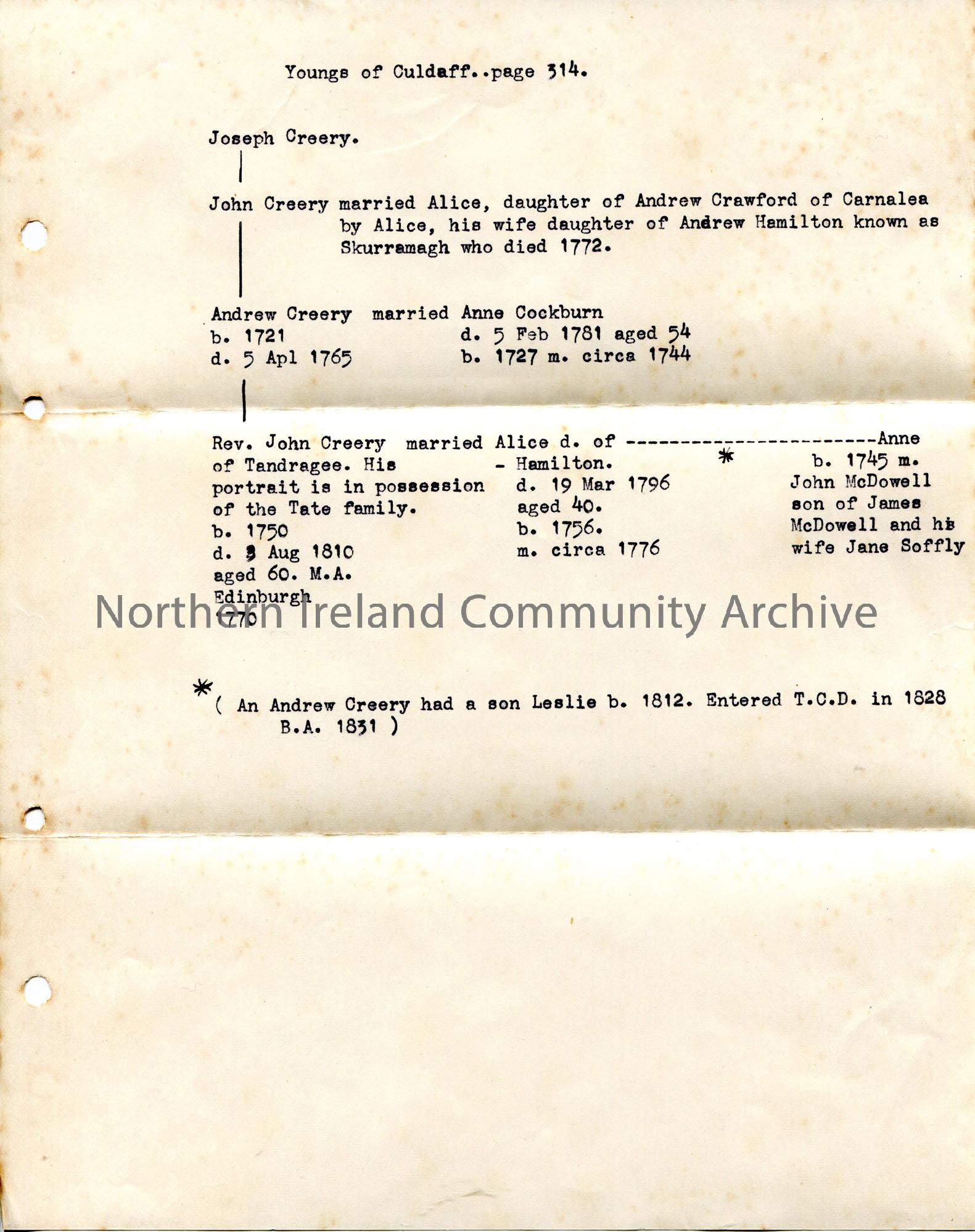 Typed family tree re Creery family. Taken from Youngs of Culdaff..page 314. Mentions placenames Skurramagh, Carnalea, Tandragee, Edinburgh.