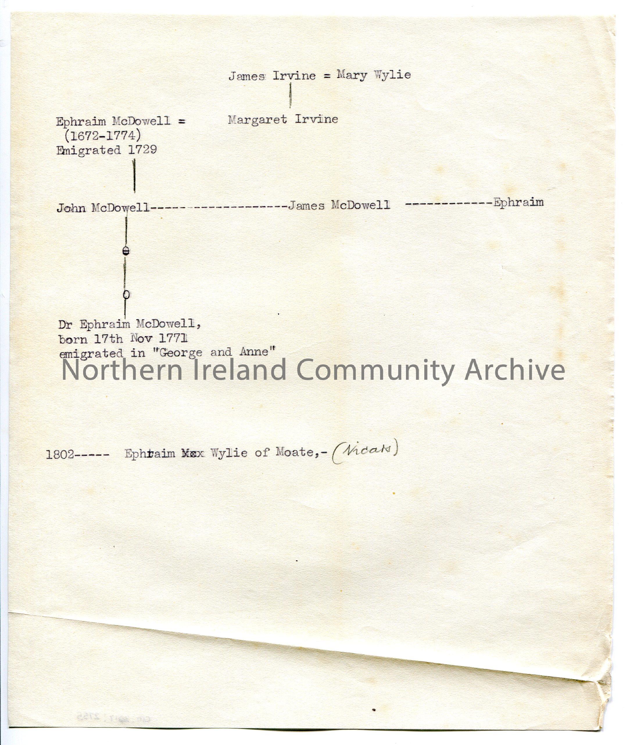 Typed family tree re family names Irvine and McDowell. Dates late 17th century to late 18th century.