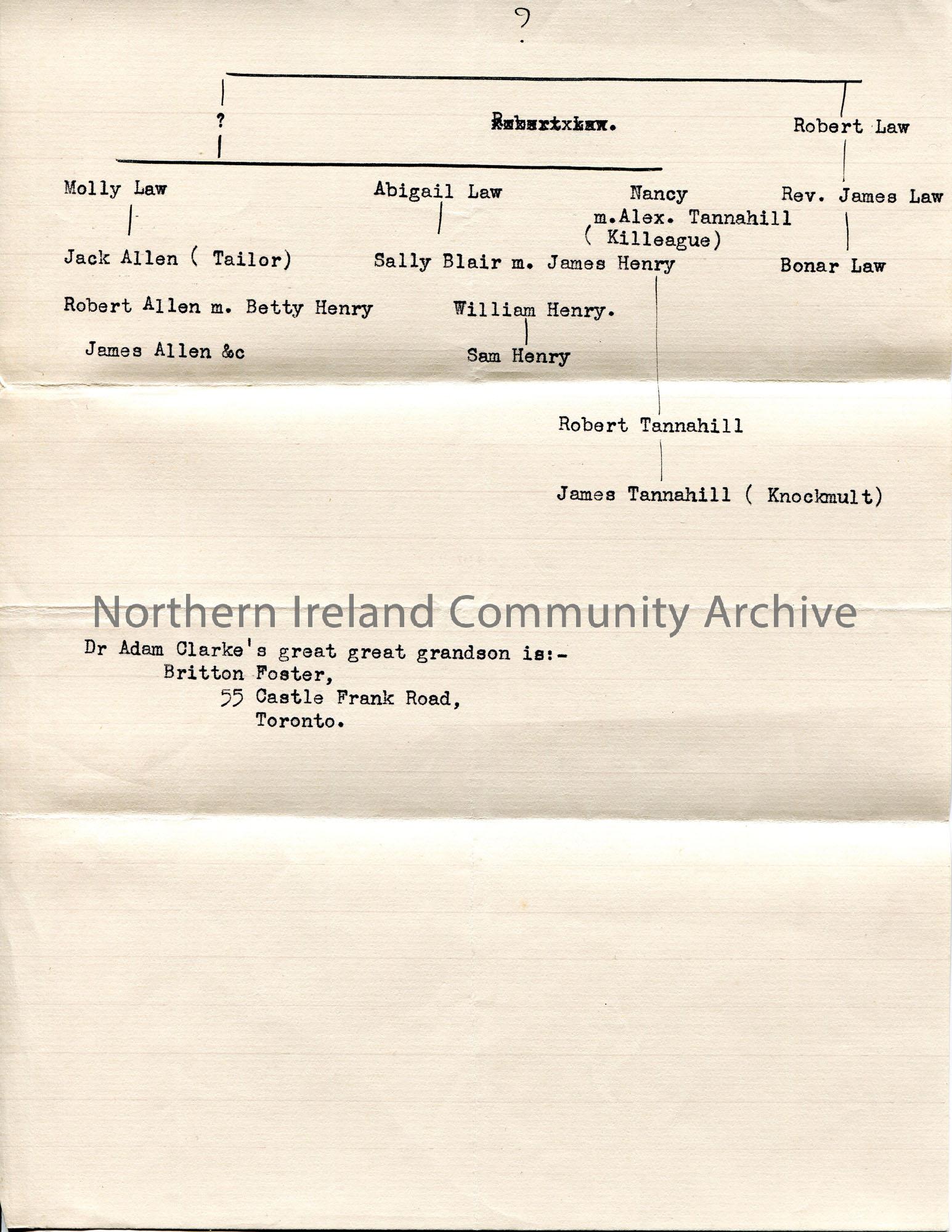Typed family tree re Law family. Mentions surnames Allen, Blair, Henry and Tannahill. Sam Henry is within this family tree. Mentions Rev Adam Clarke's great great Grandson is Britton Foster, Toronto.