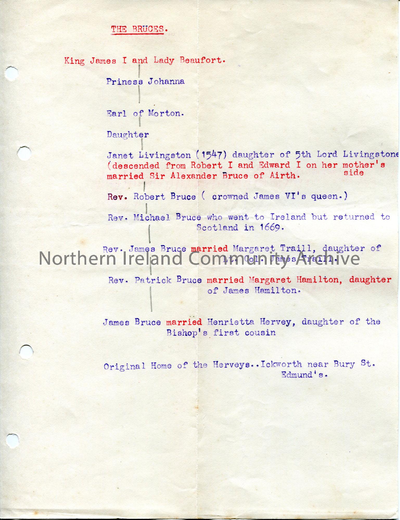 Typed family tree titled, ‘Bruces’. King James I and Lady Beaufort are at the top. Mentions surnames Livingston, Bruce, Traill, Hamilton and Hervey.