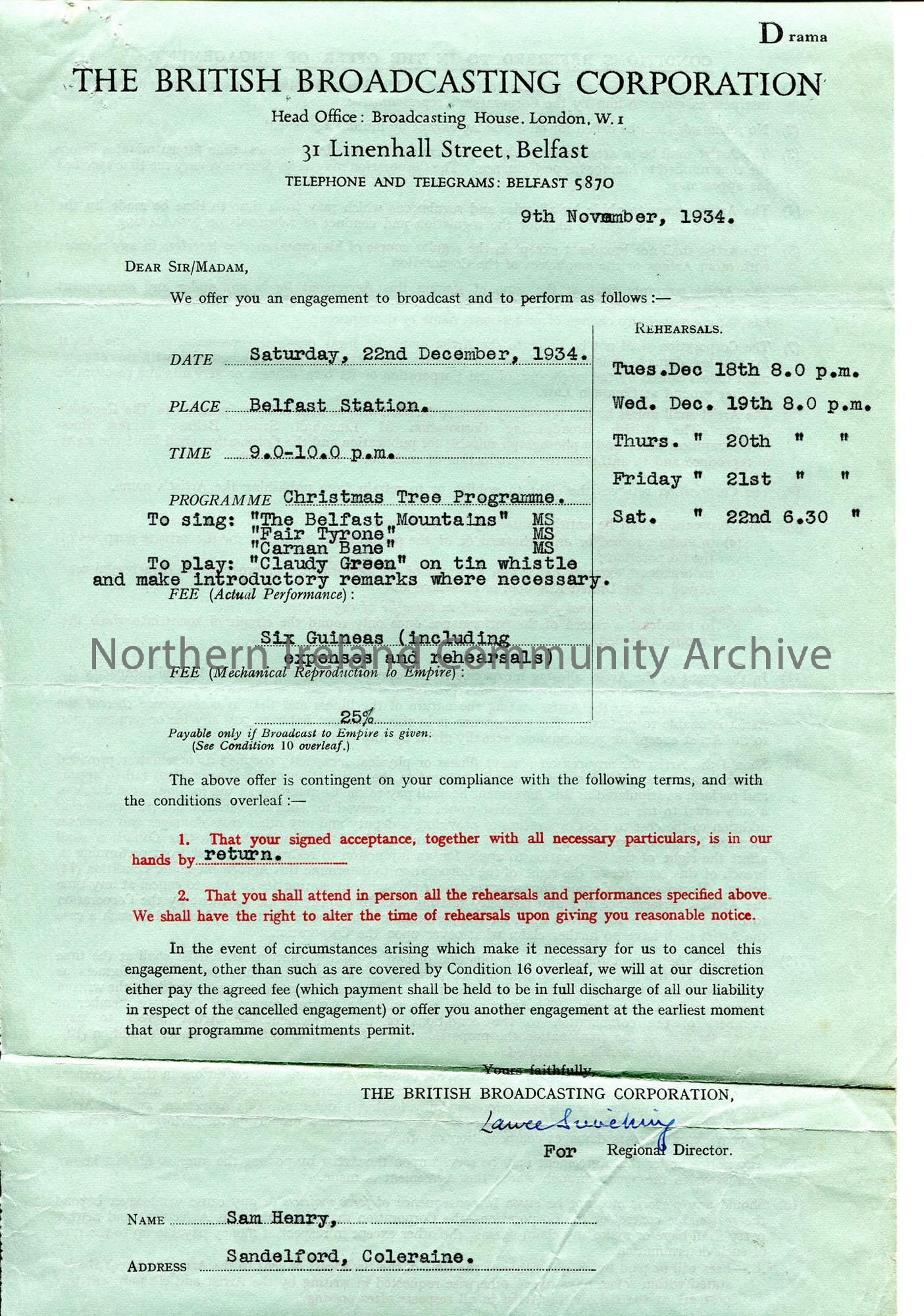 Typed formal agreement from BBC, for broadcast and rehearsals in December 1934 for the 'Christmas Tree' programme - dates, times, titles of songs to be sung, fee.