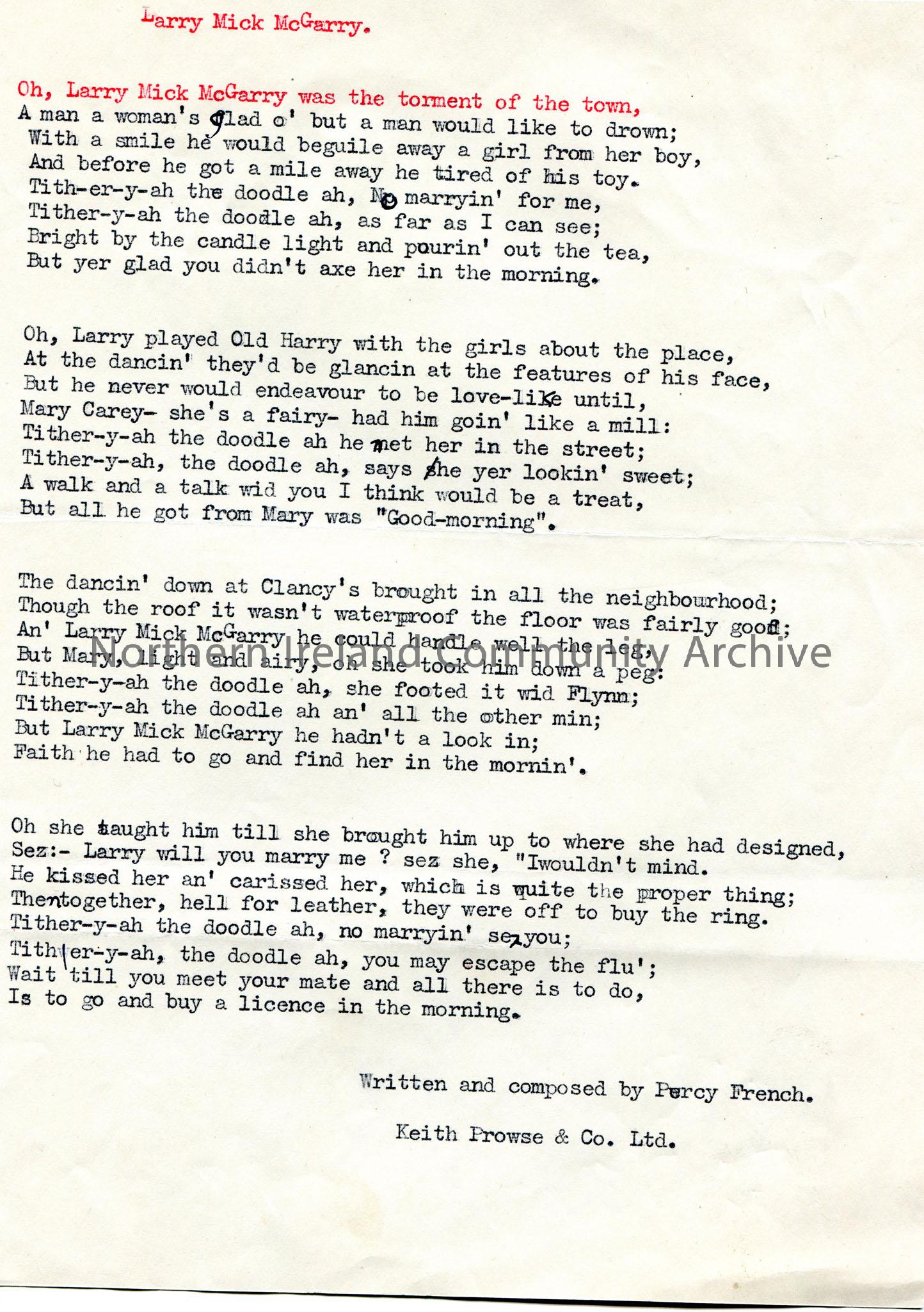 Typed four verse song titled ‘Larry Mick McGarry’. Written and composed by Percy French. Keith Prowse & Co. Ltd typed at bottom of page.