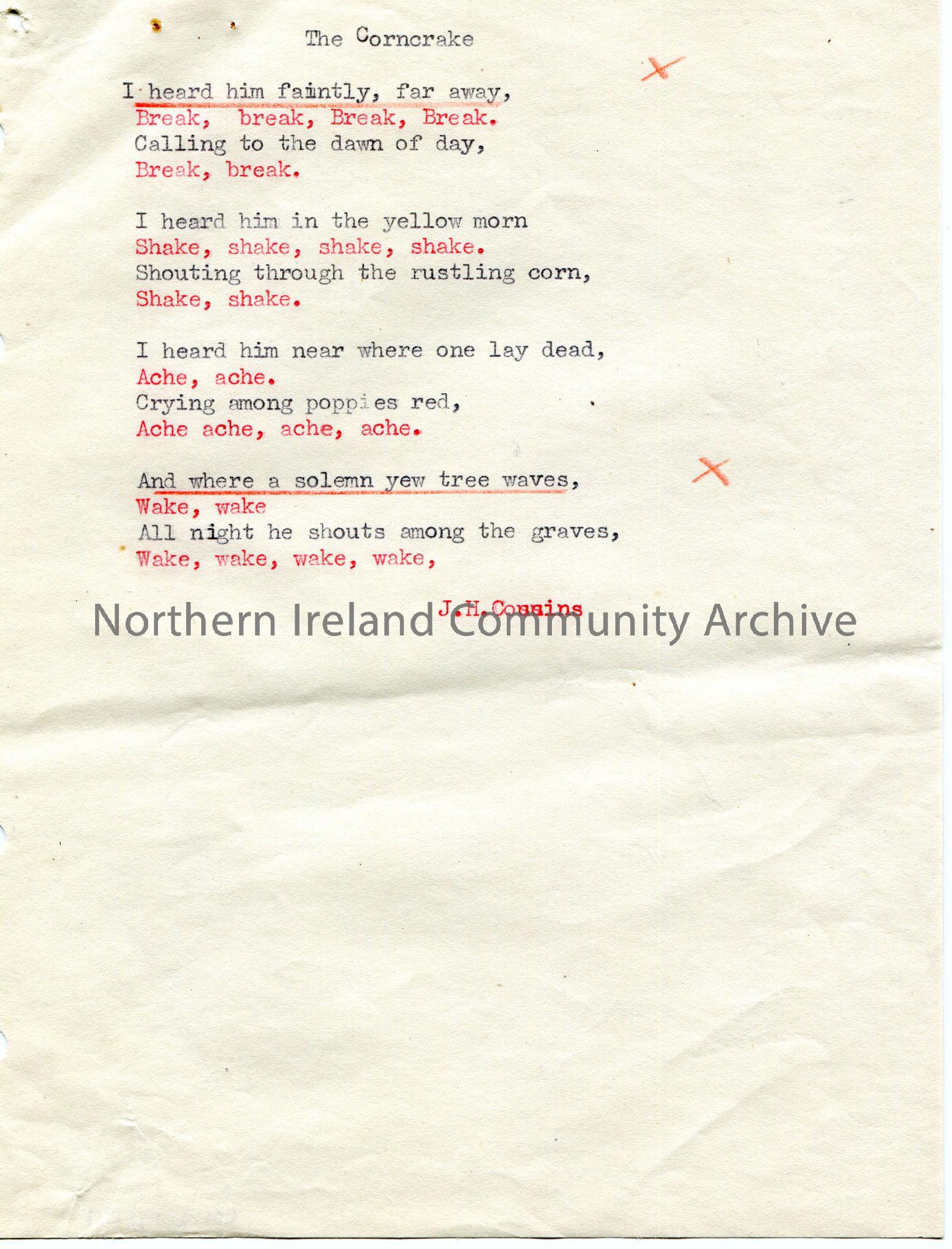 Typed four verses of a poem or words to a song titled, ‘The Corncrake’, by J.H.Cousins. Re the corncrake bird.