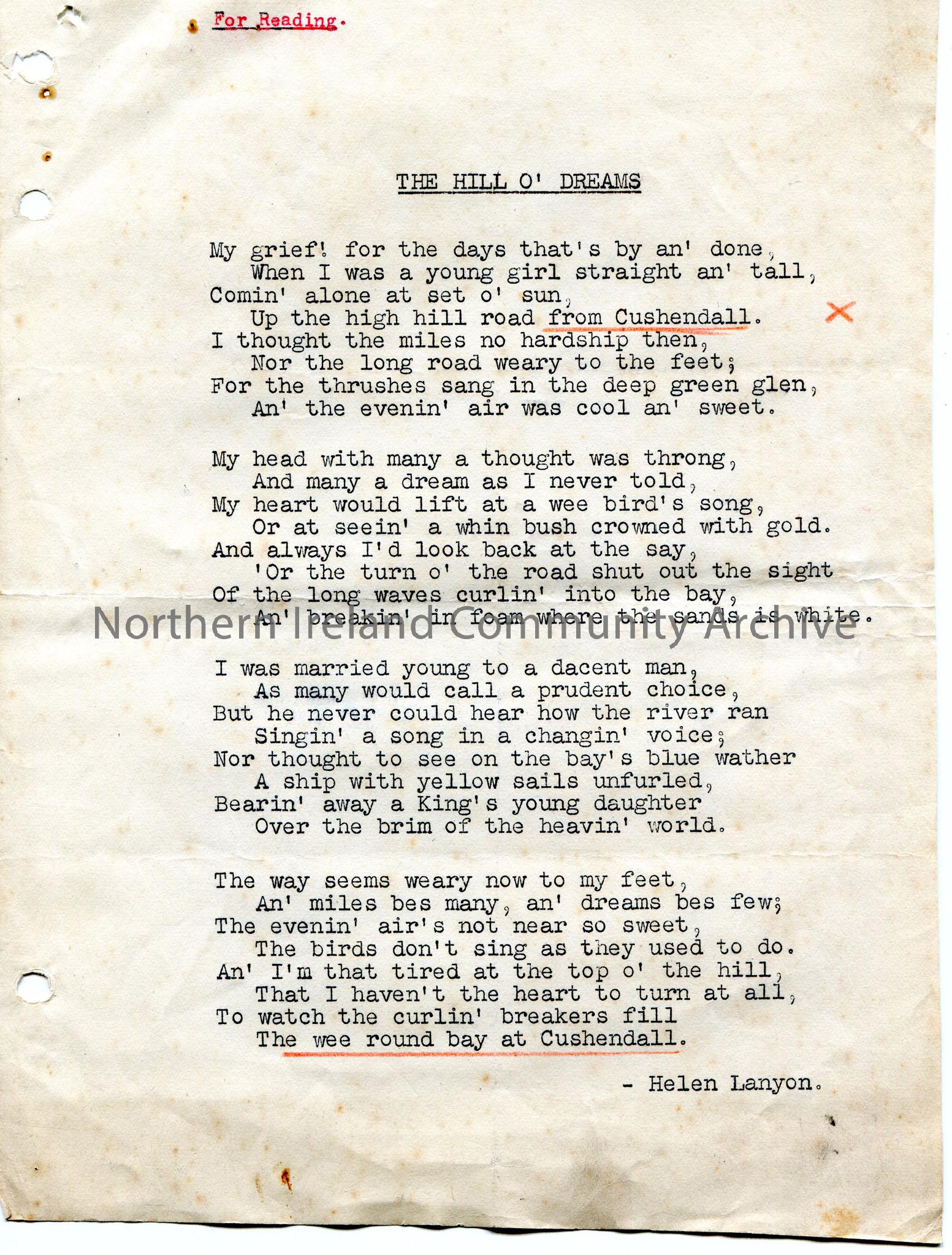 Typed four verses of a poem or words to a song titled, ‘The Hill O’Dreams’, by Helen Lanyon. Re the bay at Cushendall.