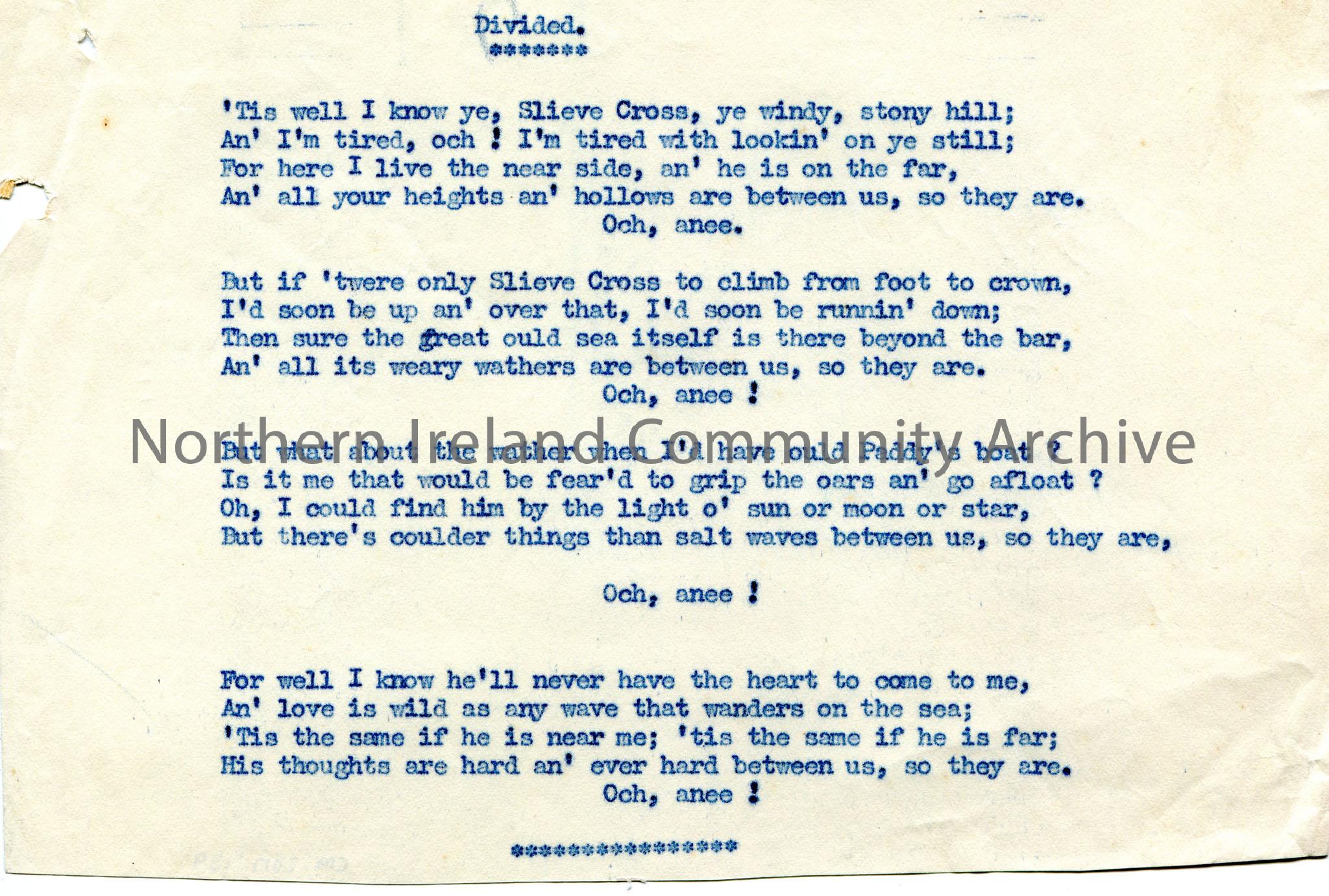 Typed four verses of poem or words to song titled, ‘Divided’. Written in local dialect. Re Slieve Cross.