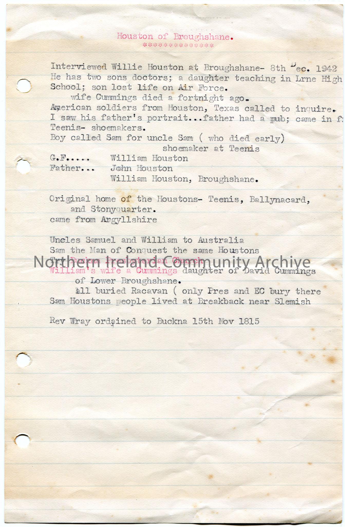 Typed genealogical information on lined paper re Houston of Broughshane. Notes from an interview with Willie Houston at Broughshane on 8th December, 1942.