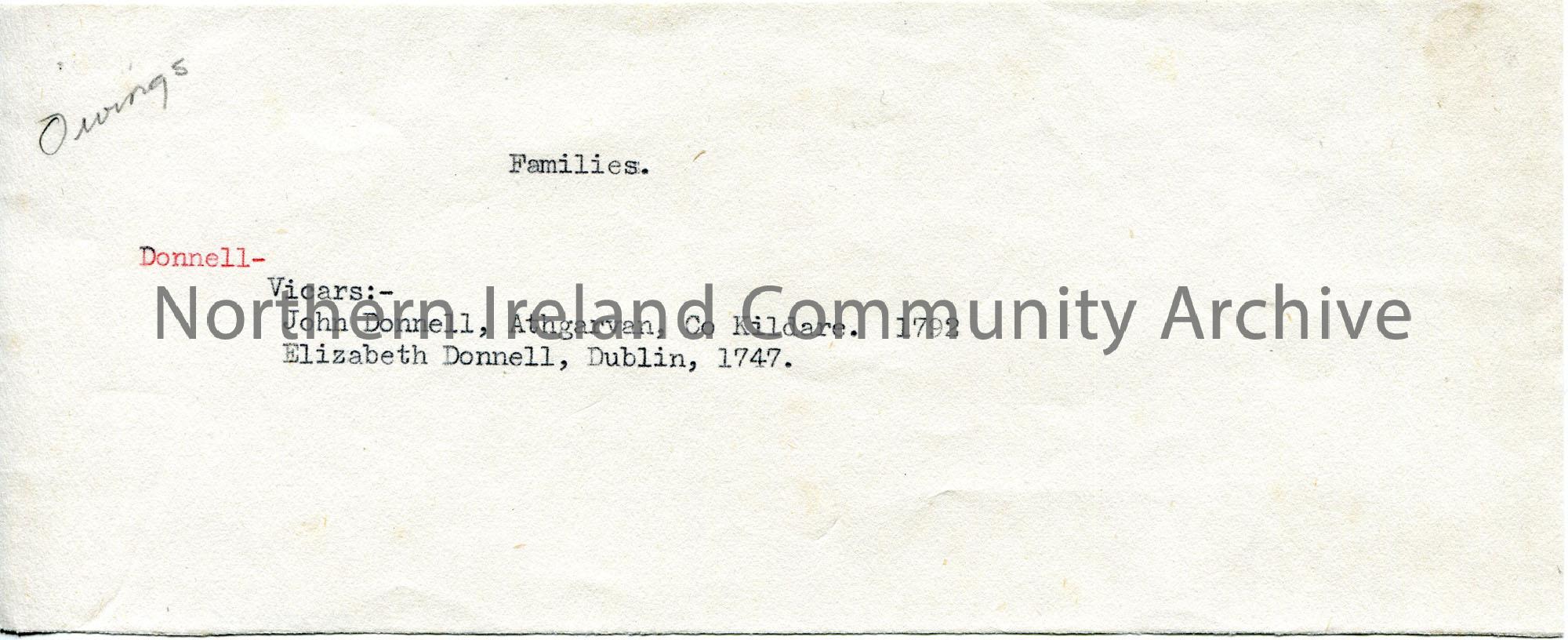 Typed genealogical note titled, ‘Families’. Mentions John and Elizabeth Donnell, Kildare and Dublin. ‘Owings’ handwritten top corner of page.