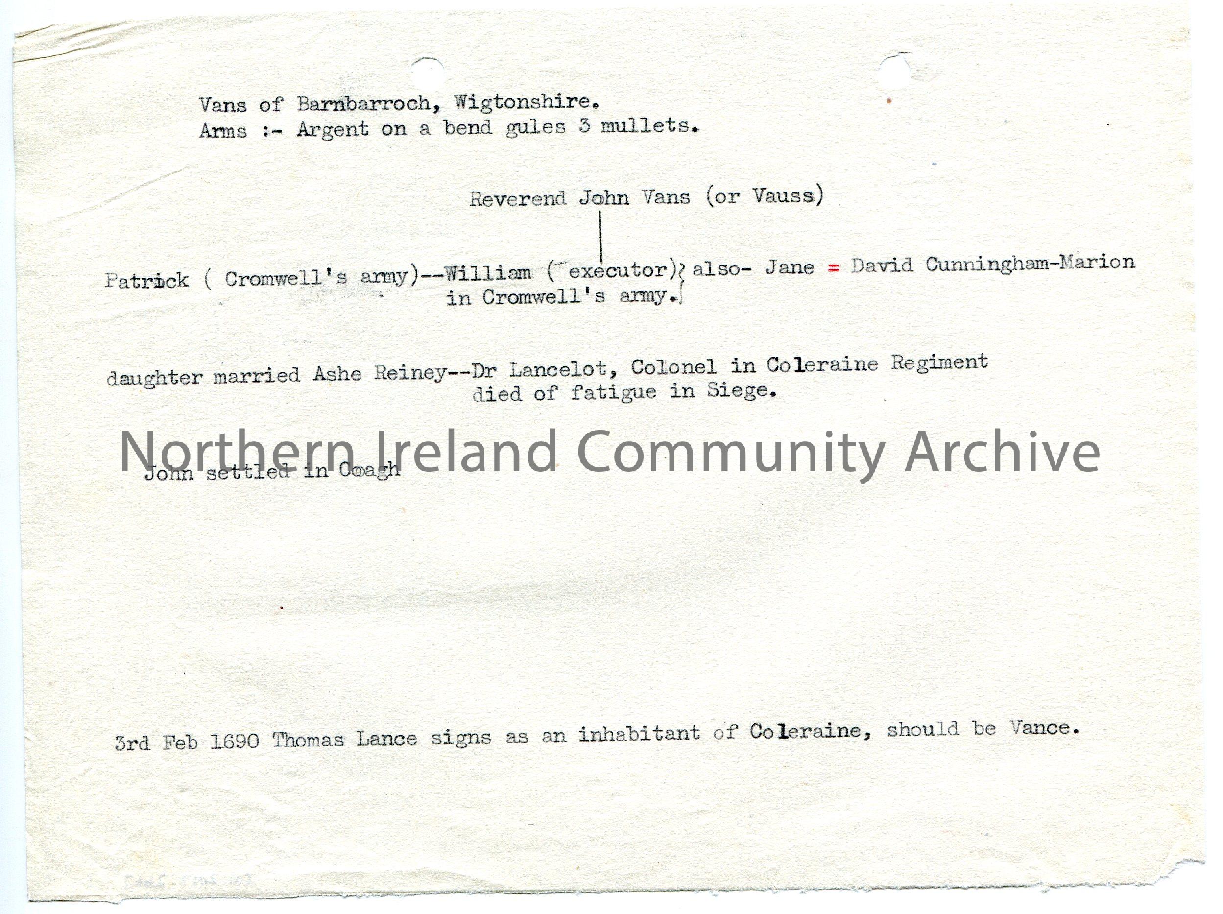 Typed genealogical notes of research re Reverend John Vans (or Vauss). Mentions Dr Lancelot, Colonel in Coleraine Regiment and Thomas Lance signs as inhabitant of Coleraine in 1690 and should read Vance.