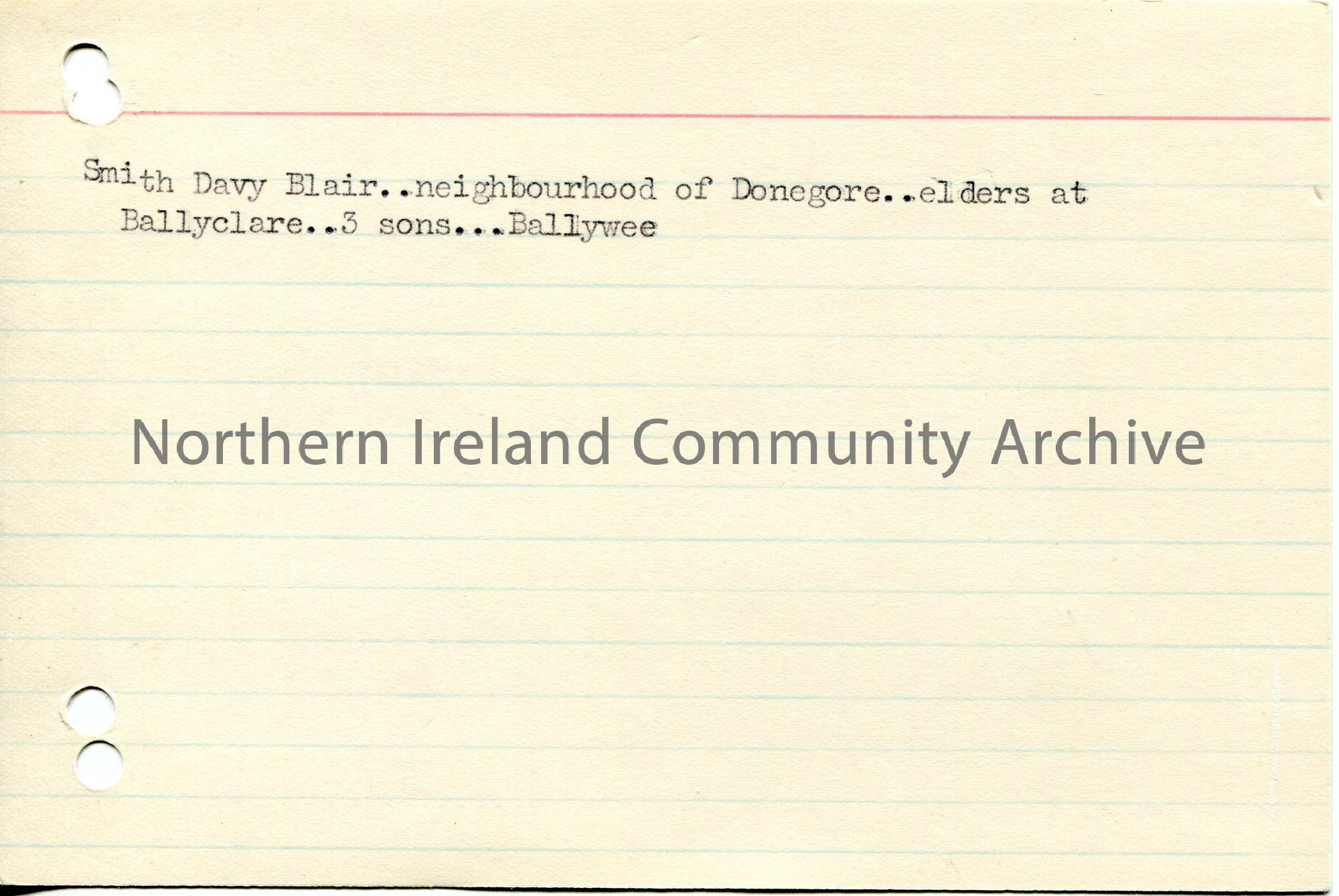 Typed genealogical notes on lined card re surname Blair. Re Smyth Davy Blair.