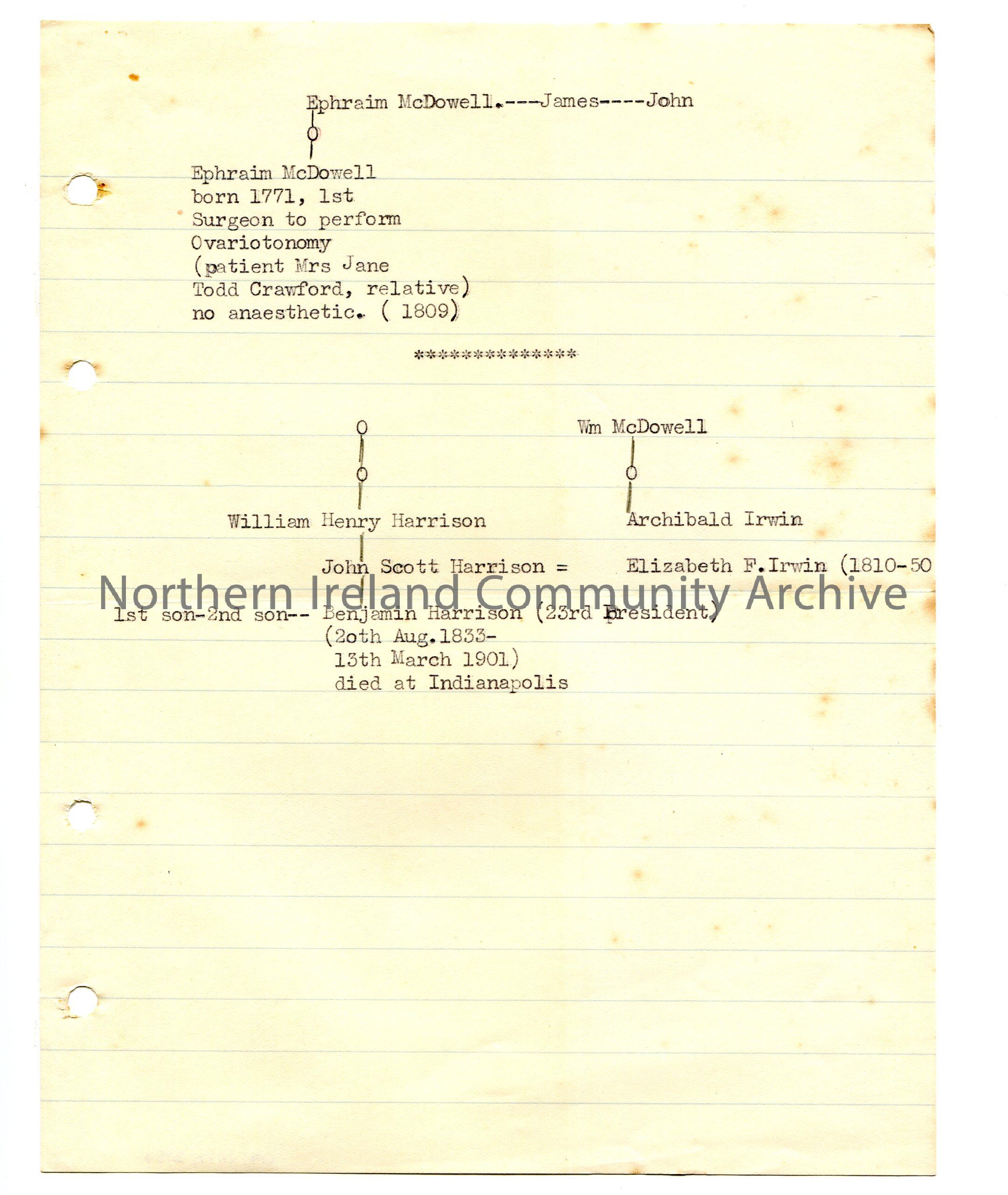 Typed genealogical notes on lined paper re McDowell and Harrison families.