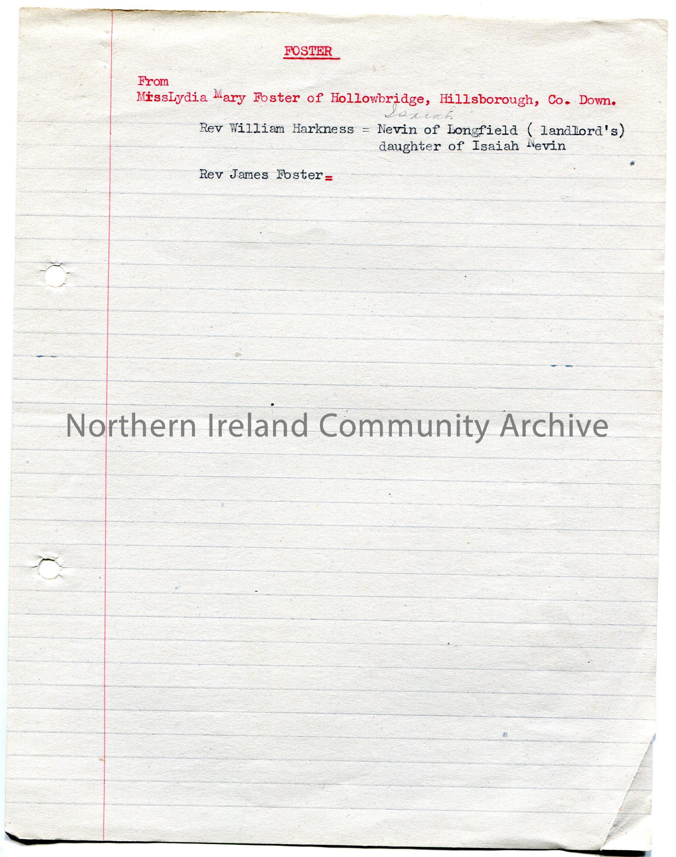 Typed genealogical notes on lined paper titled, 'Foster'. They are notes from Miss Lydia Mary Foster of Hollowbridge, Co. Down. They appear to have been started but not finished.