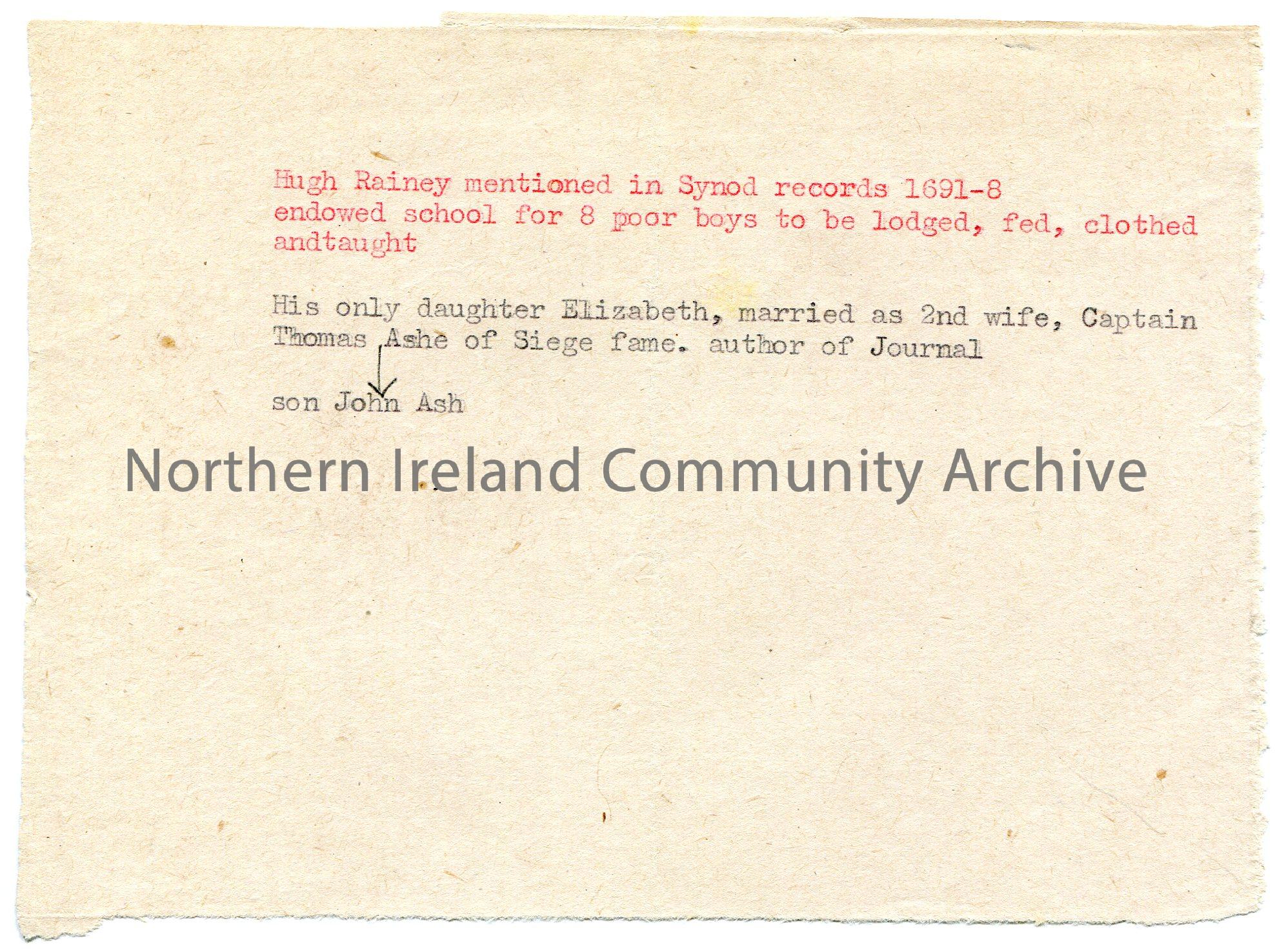 Typed genealogical notes re Hugh Rainey. Mentions his daughter Elizabeth who married Captain Thomas Ashe.