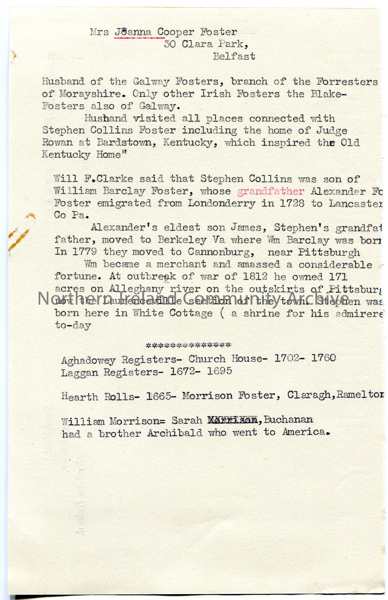 Typed genealogical notes re Stephen Collins Foster. Appear to be from Mrs Joanna Cooper Foster, 30 Clara Park, Belfast. Other sources mentioned are Aghadowey Registers, Church House; Hearth Rolls 1665 and William Morrison. Typed on the back of Sam Henry's personal headed paper.