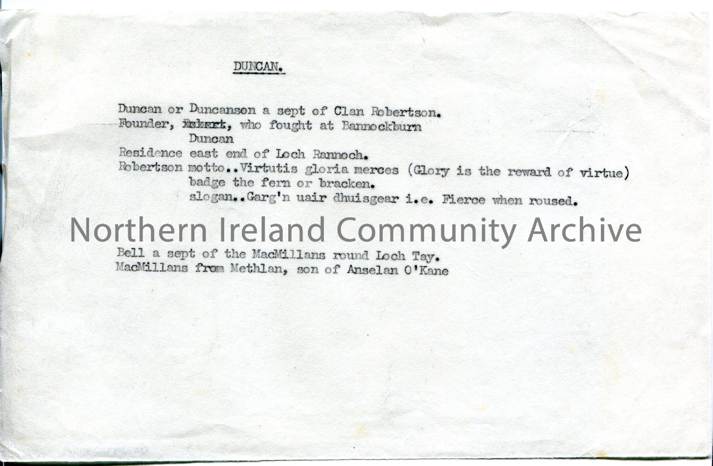 Typed genealogical notes re surname Duncan and MacMillan.