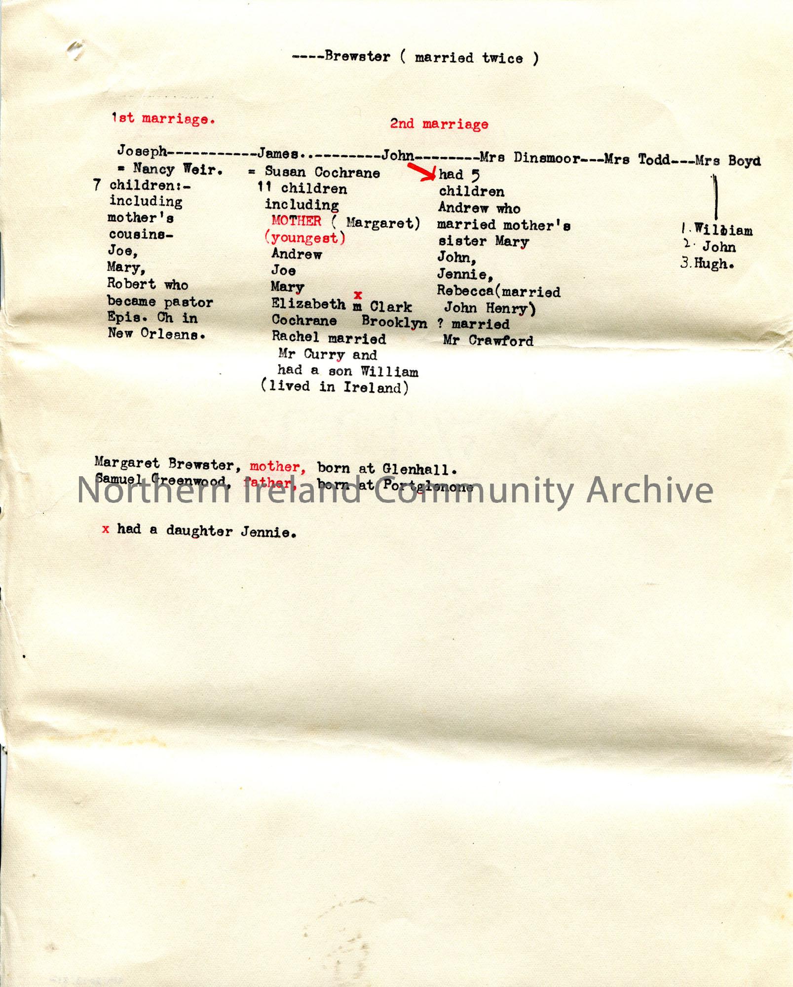 Typed genealogical notes titled 'Brewster (married twice)'. Part of genealogy research carried out by Sam for John Brewster of New York whose family were originally from Ireland.