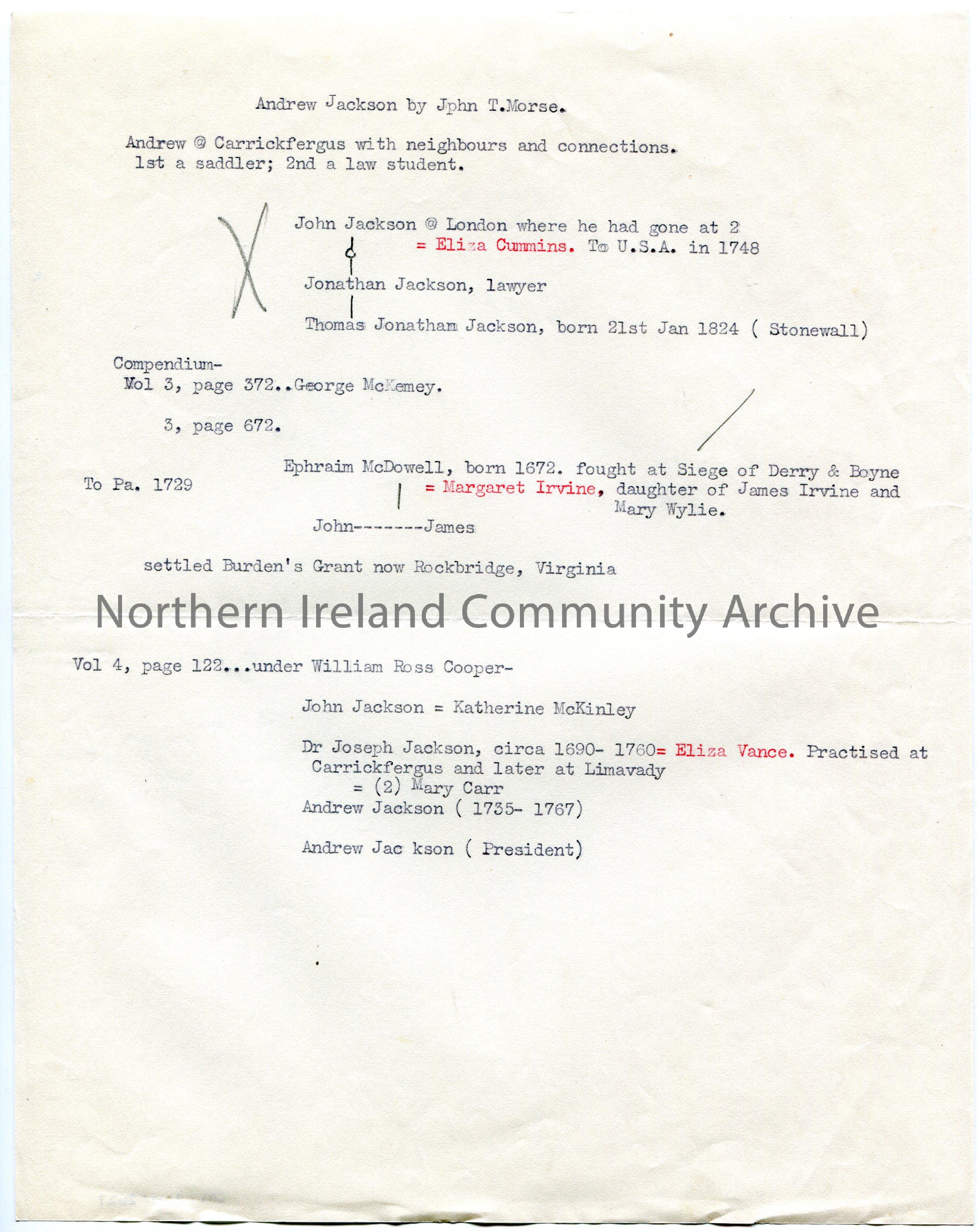Typed genealogical research re the Jackson family name. Titled, 'Andrew Jackson by Jphn [John] T. Morse'. The names Eliza Cummins, Margaret Irvine and Eliza Vance typed in red.