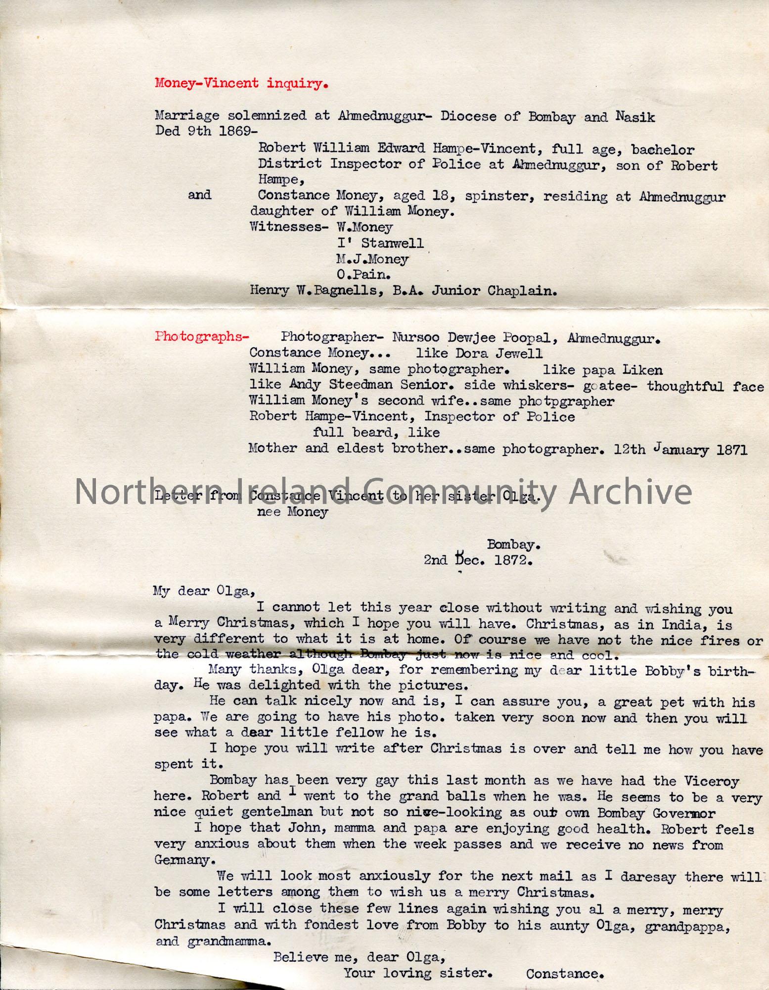 Typed genealogy notes re Money-Vincent inquiry that Sam was working on for Mr F. A. M. Vincent.