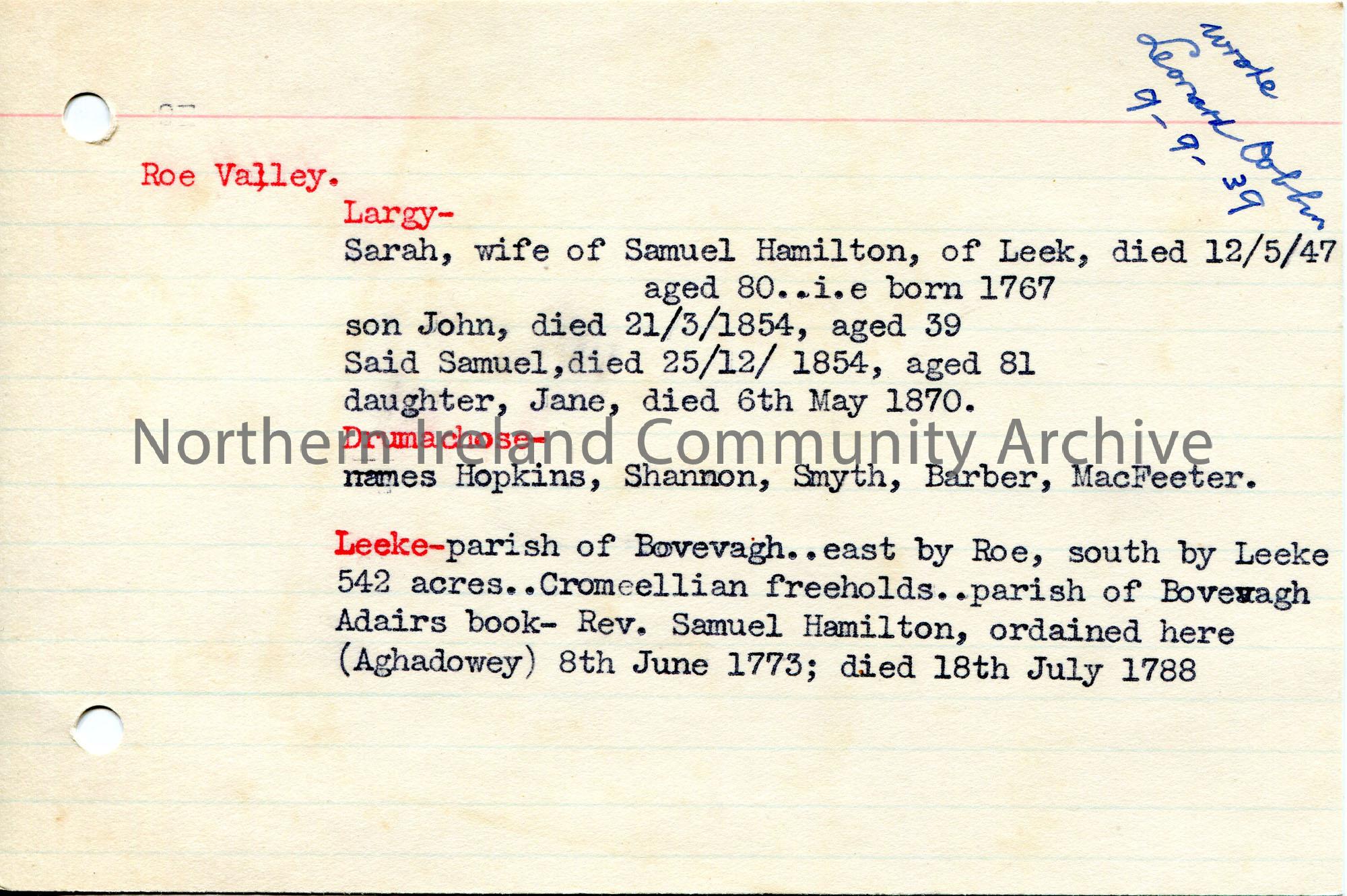 Typed genealogy research notes on lined card. Re surnames in the Roe Valley area - Largy, Drumachose and Leeke. Researching name Hamilton. Handwritten note top right corner 'wrote Leonard Dobbin 9-9-39'.