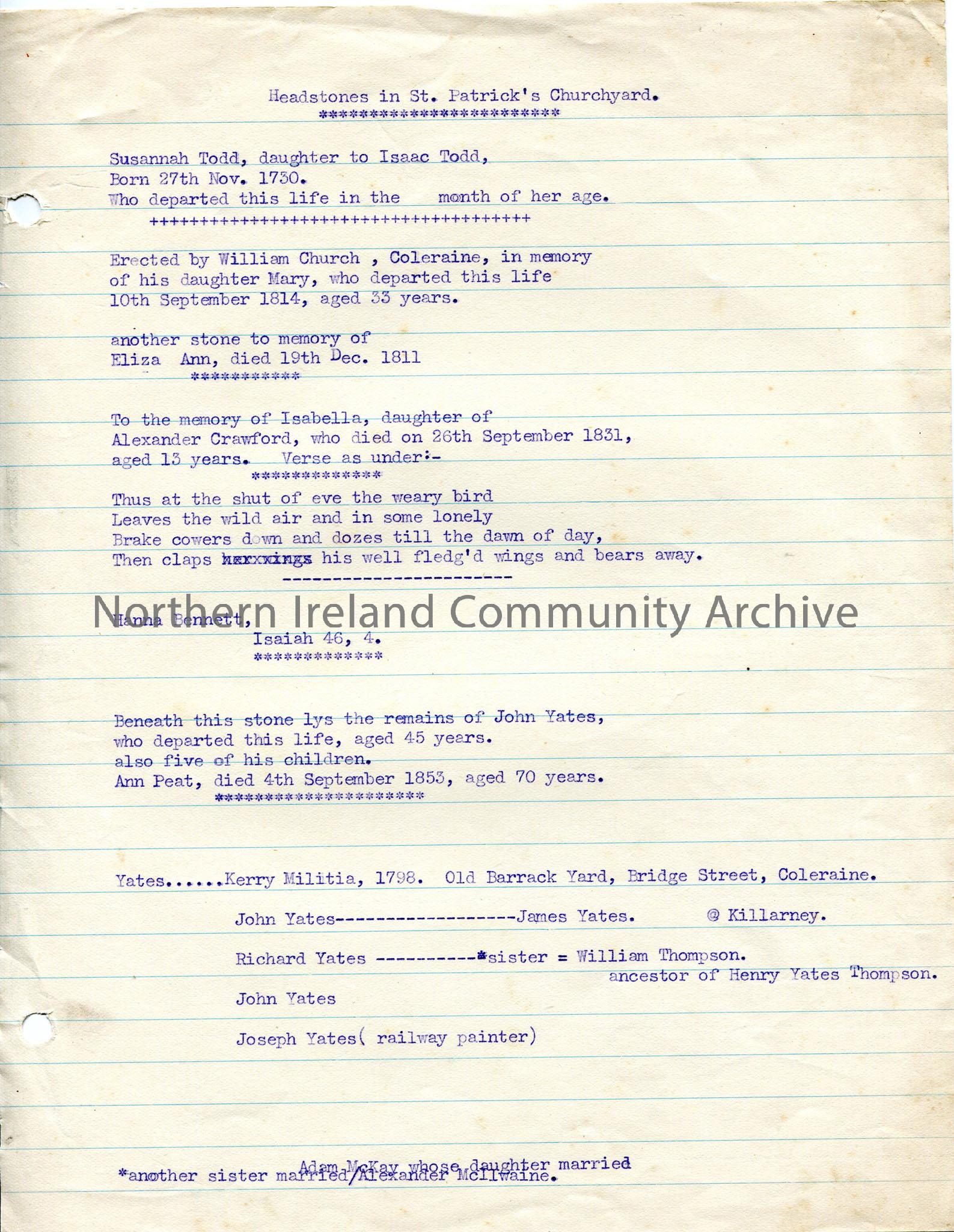 Typed headstone inscriptions from graves in St Patrick's Churchyard - Todd, Church, Crawford, Bennett, Yates