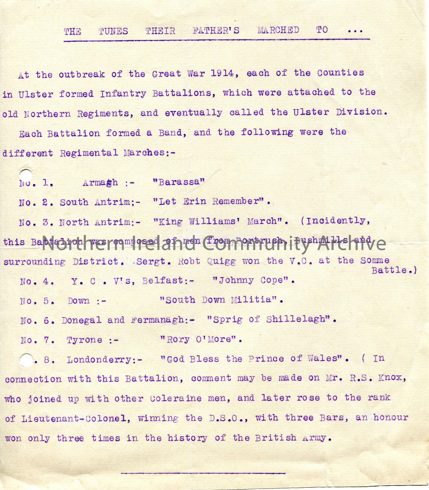 Typed information on regimental marches for WWI battalions in Ulster Division, including notes on Robert Quigg V C of Bushmills and R S Knox from Cole…