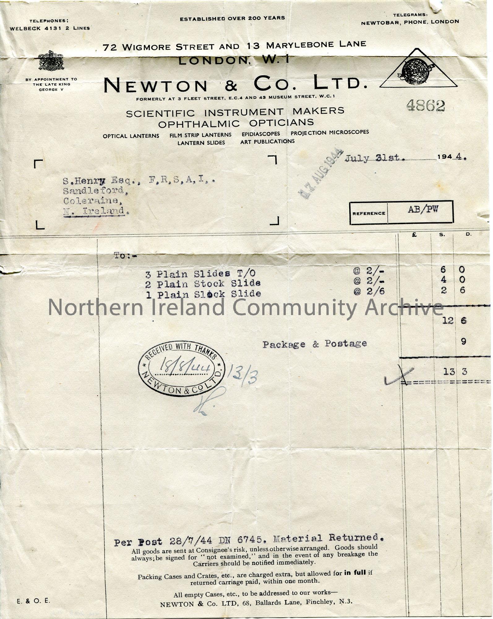 Typed invoice on headed paper for Sam Henry from Newton & Co. Ltd. Dated 31st July 1944. For 3 plain slides t/o, 2 plain slides and 1 plain slock slide. Total of £0.13.3. Received with thanks stamp dated 18th August 1944.