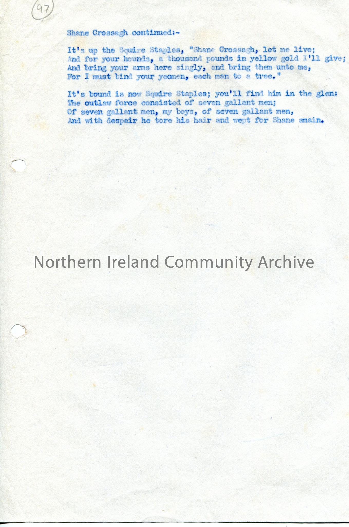 Typed last two verses of song ‘Shane Crossagh’. First nine verses are missing. Number ’97’ written in top corner and circled.
